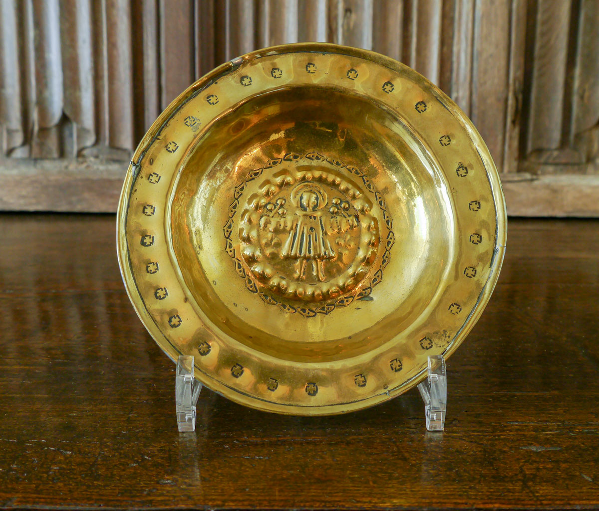 This unusually small alms dish shows the Christ child in the centre, arms outstretched, and a halo around his head. The rim has a band of punch-decorated crosses, there is some wear to the outside of the rim, but could be forgiven when considering the rare size - 6.5 inches (16.5 centimetres).