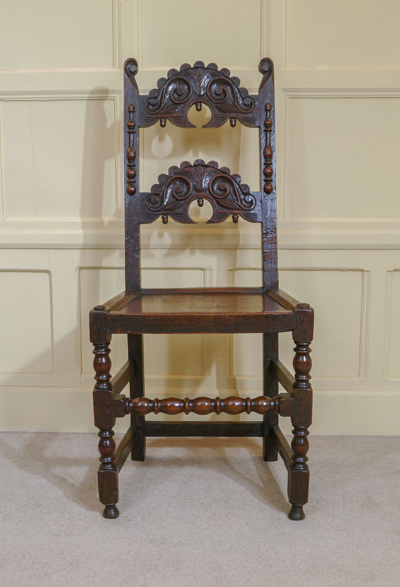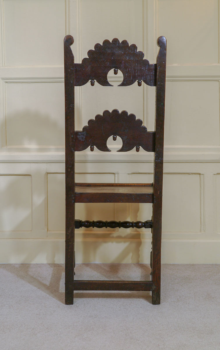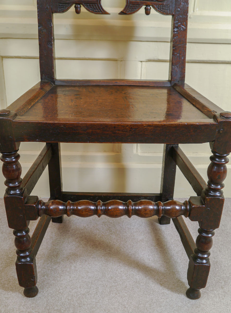 The inset seat is made from a single oak board, and supported by bobbin and reel turned legs, joined by a similarly turned centre stretcher, and stand on the original turned toes.