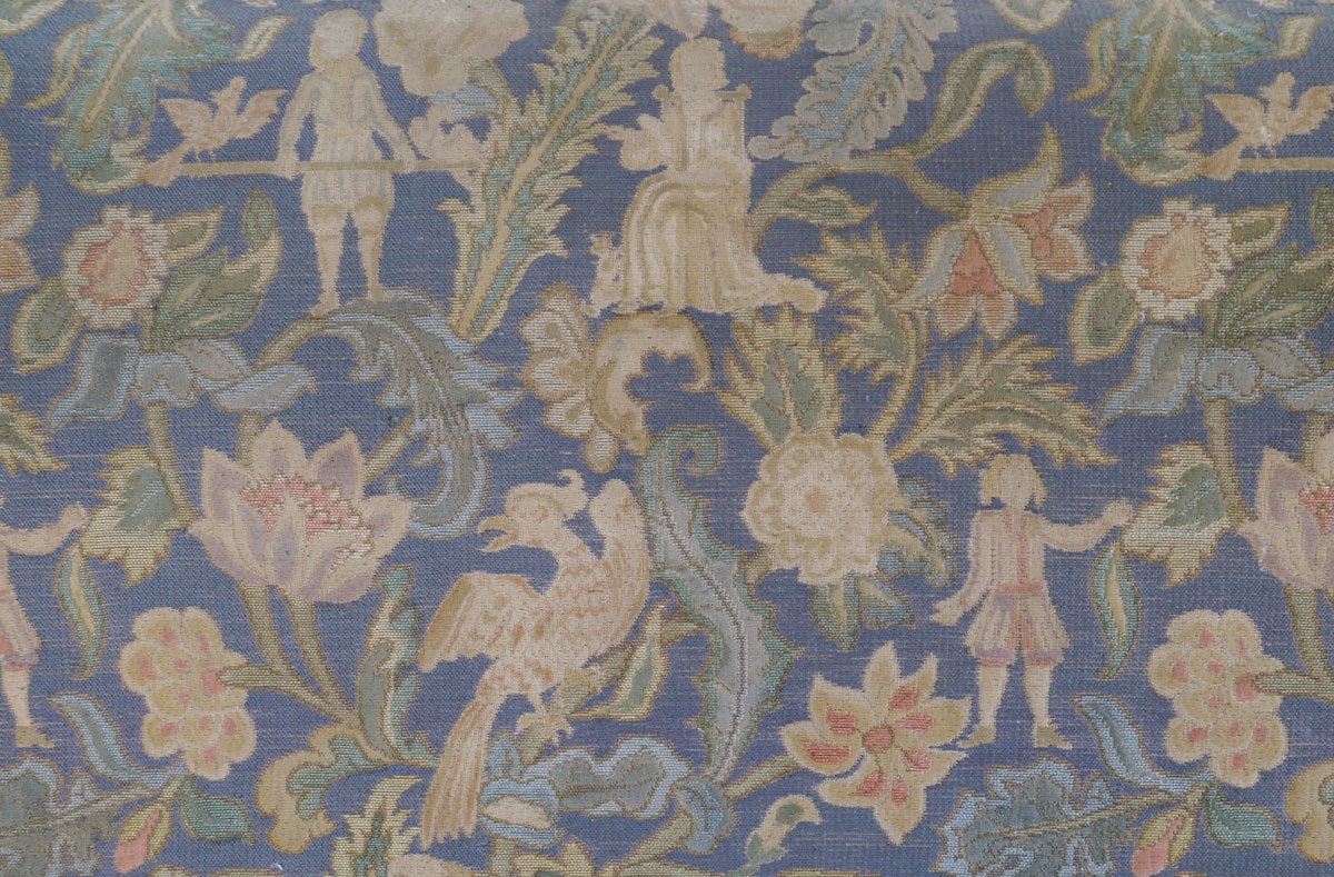 Having a rectangular back and shaped outcurving arms, which are upholstered in the original tapestry, woven with floral motifs, figures and exotic birds.