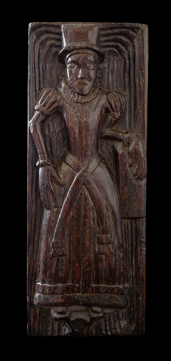 Deeply carved, the panels show a male and female attired in the correct costume for the wealthy class of the mid 16th century.