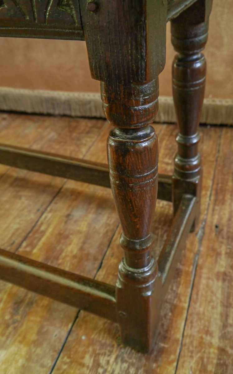The well-turned baluster legs have a good outward splay, and are joined by plain stretchers all round, a further unusual feature. It is more common for a bench to have an 'H' stretcher (although this is uncommon in joint stools).