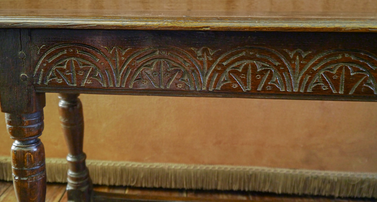 The two long rails have strong lunette-carved decoration, embellished with small punched stars, the two short end rails are deeply moulded along the bottom. Carving on benches is most uncommon - occasionally one rail is carved, but it is a rare exception to see both rails decorated.