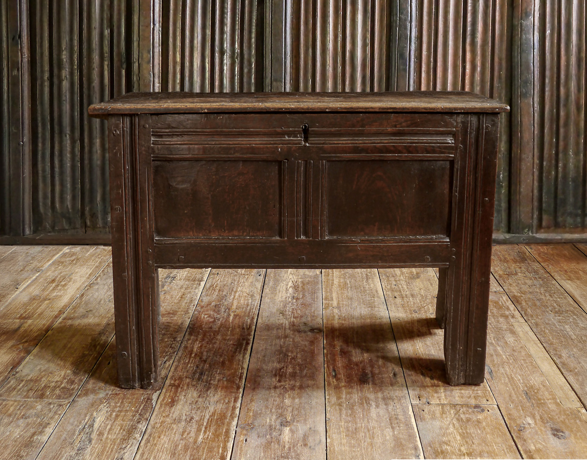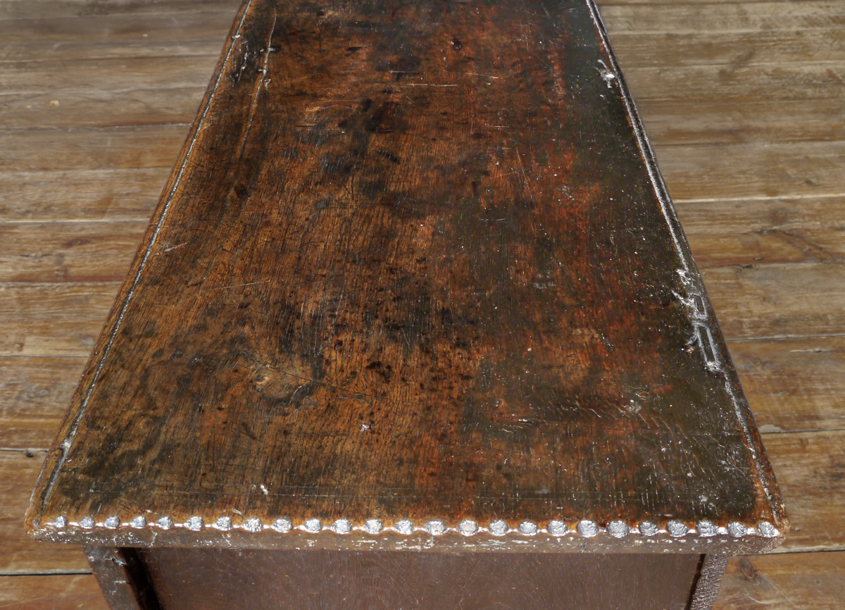 An unusually small chest, the single piece lid which retains the original iron pin hinges, has run-moulded edges to the front and back with chip-carved decoration to each end.