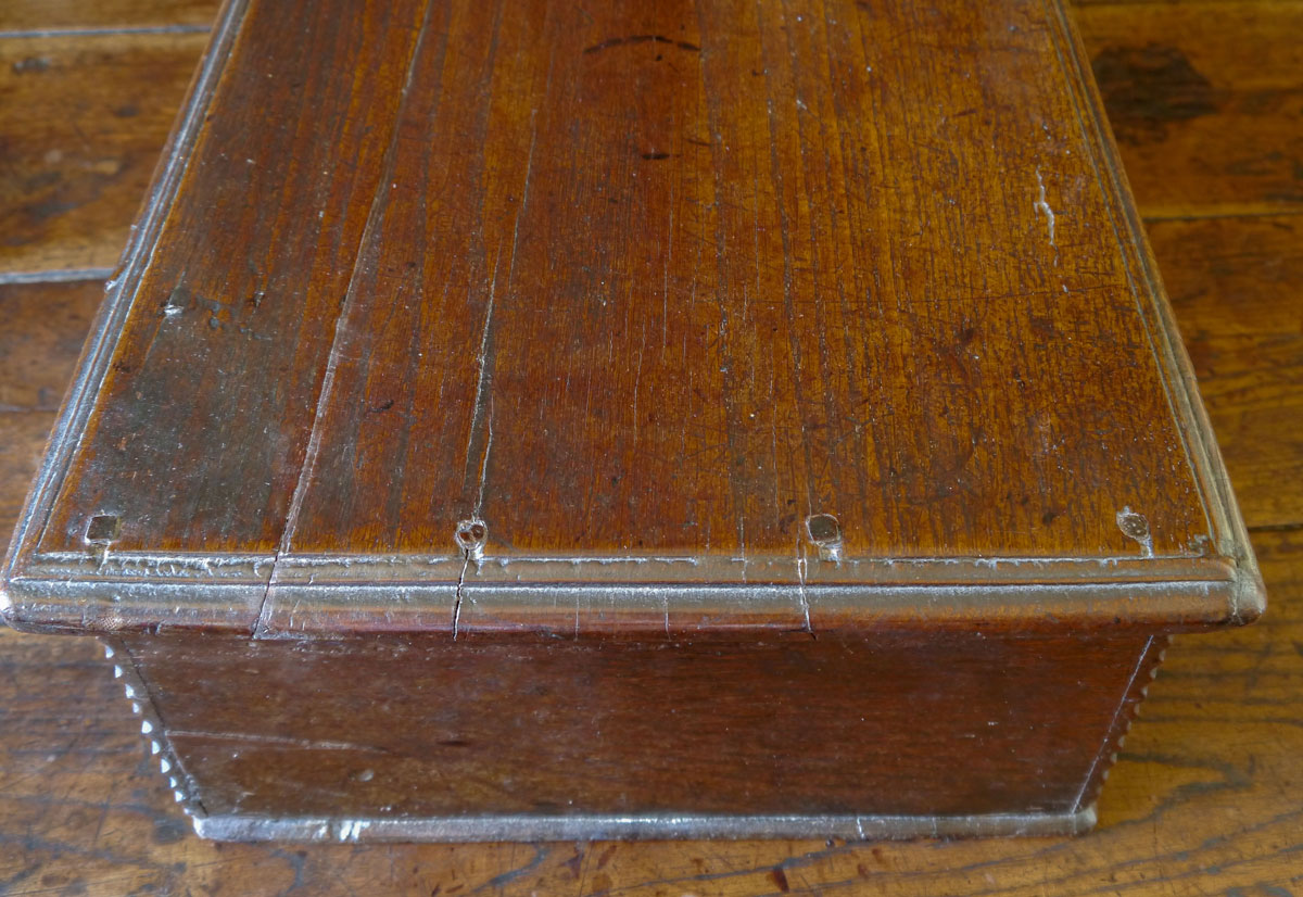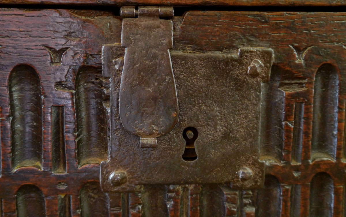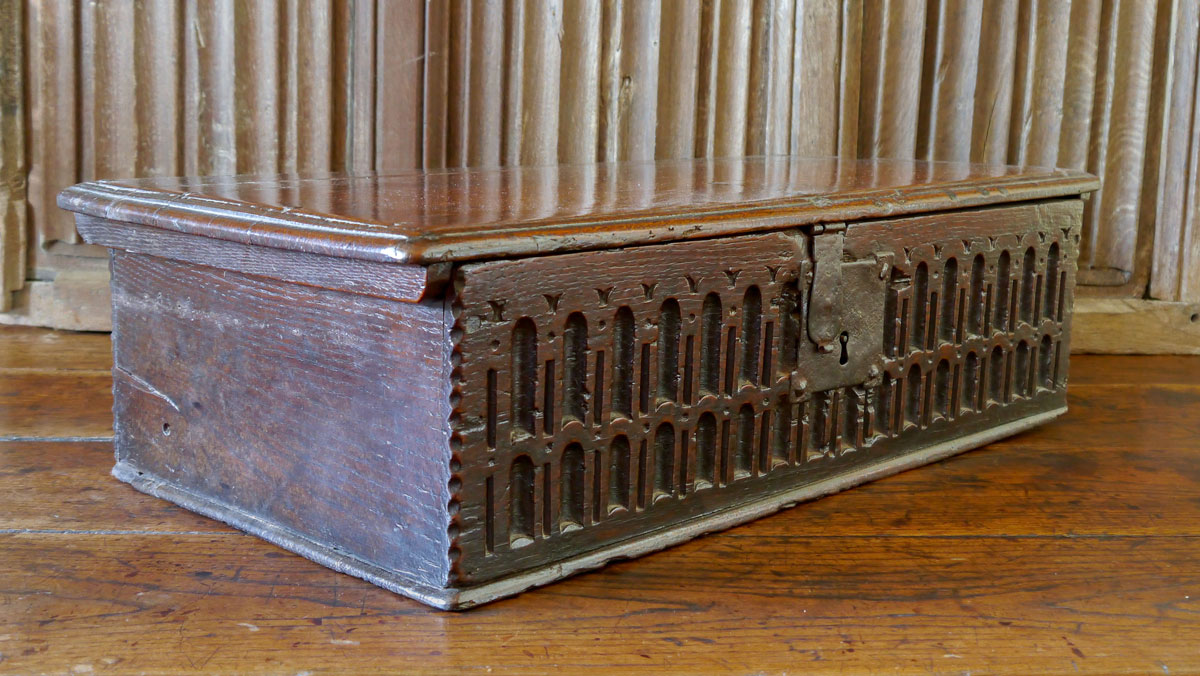 The shallow front board, with lockplate, complete with hasp and key, is carved with a double row of nulled decoration, the upper being slightly taller than the lower. The vertical end joints have fine chip-carved decoration.