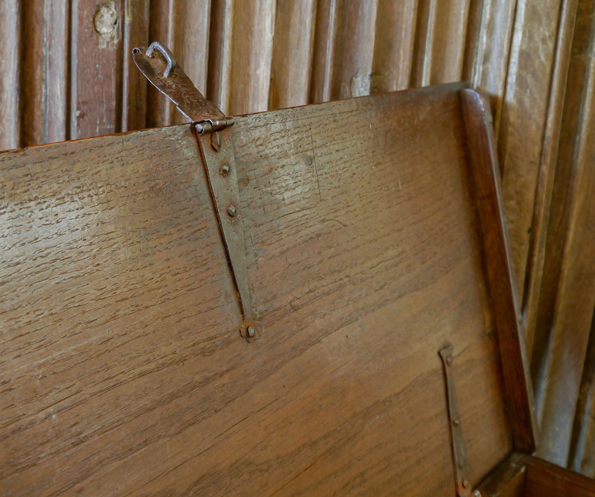 The single board lid, with a triple-moulded edge running all the way around, lifts on the original iron-strap hinges and retains a pair of lopers beneath the top, which are secured by two sets of four square oak pegs.