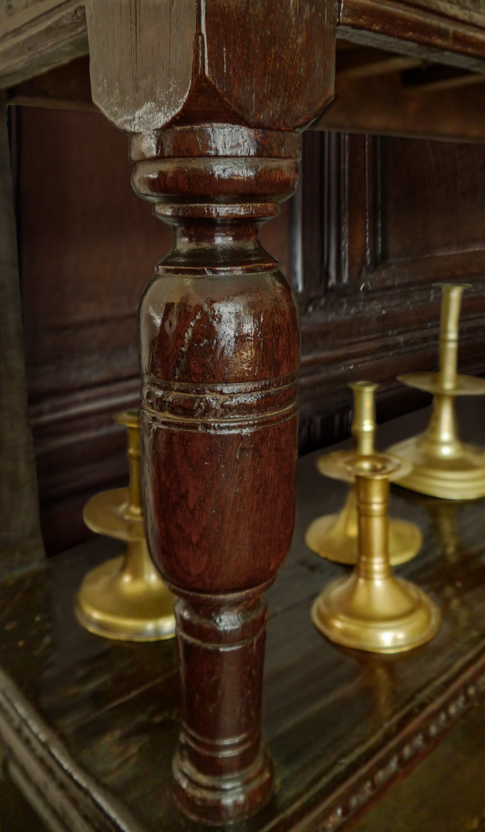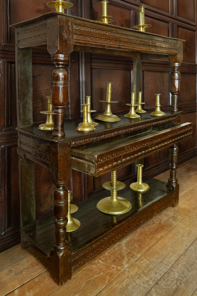 The cup board is decorated with a collection of brass 17th century trumpet-based candlesticks.
