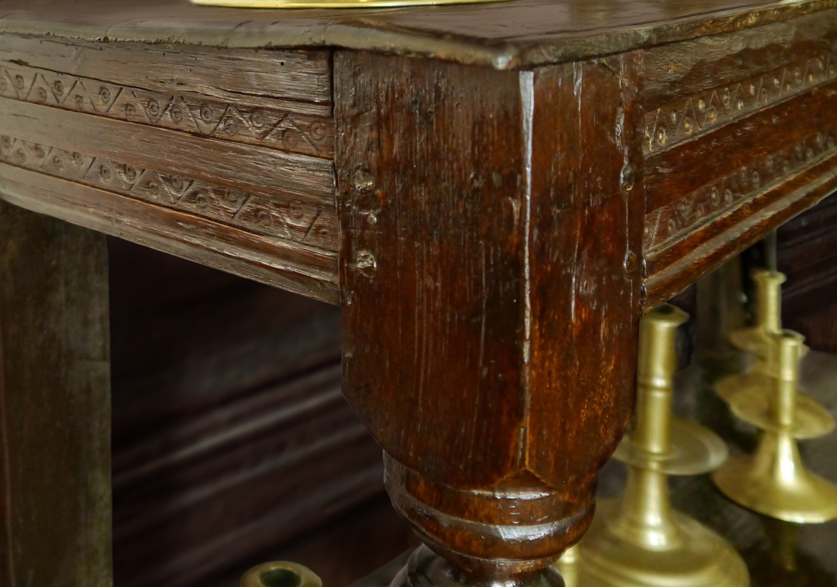 The front and side rails are decorated within the run mouldings, within simple chip carving, embellished with stamp decoration.