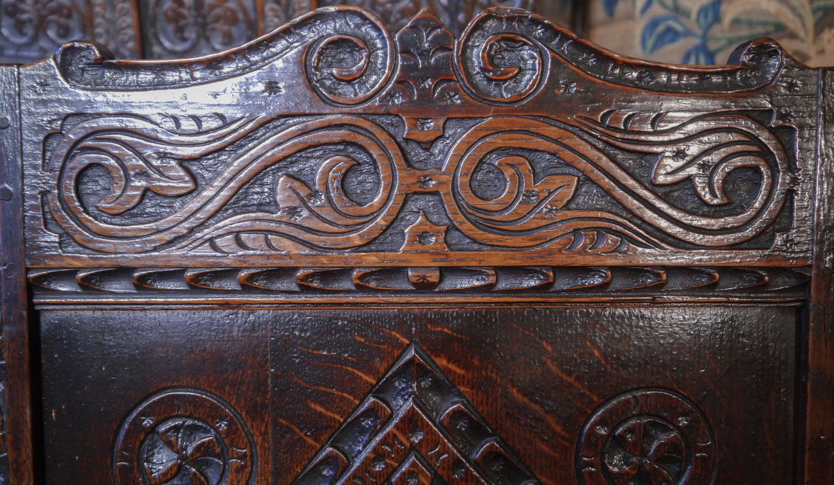 The top rail, with a low scrolled crest, set above a well-carved back panel of a lozenge with whorls to the top corners. The shaped arms, with stamp carved detail, supported on heavy inverted baluster turnings, which continue into the legs. The seat rail, with running gouge carving. Excellent colour and condition.