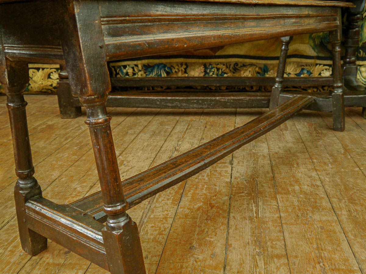 The well-grained single plank top, having a deep moulded edge, is secured to the seat rails by 10 square oak pegs.