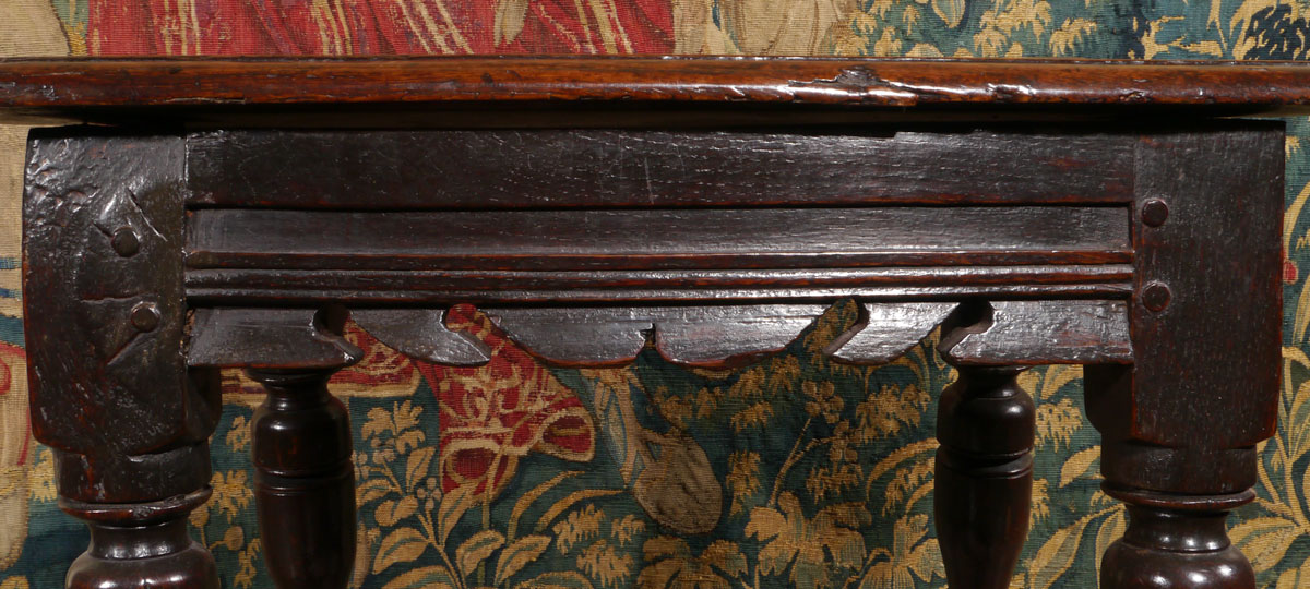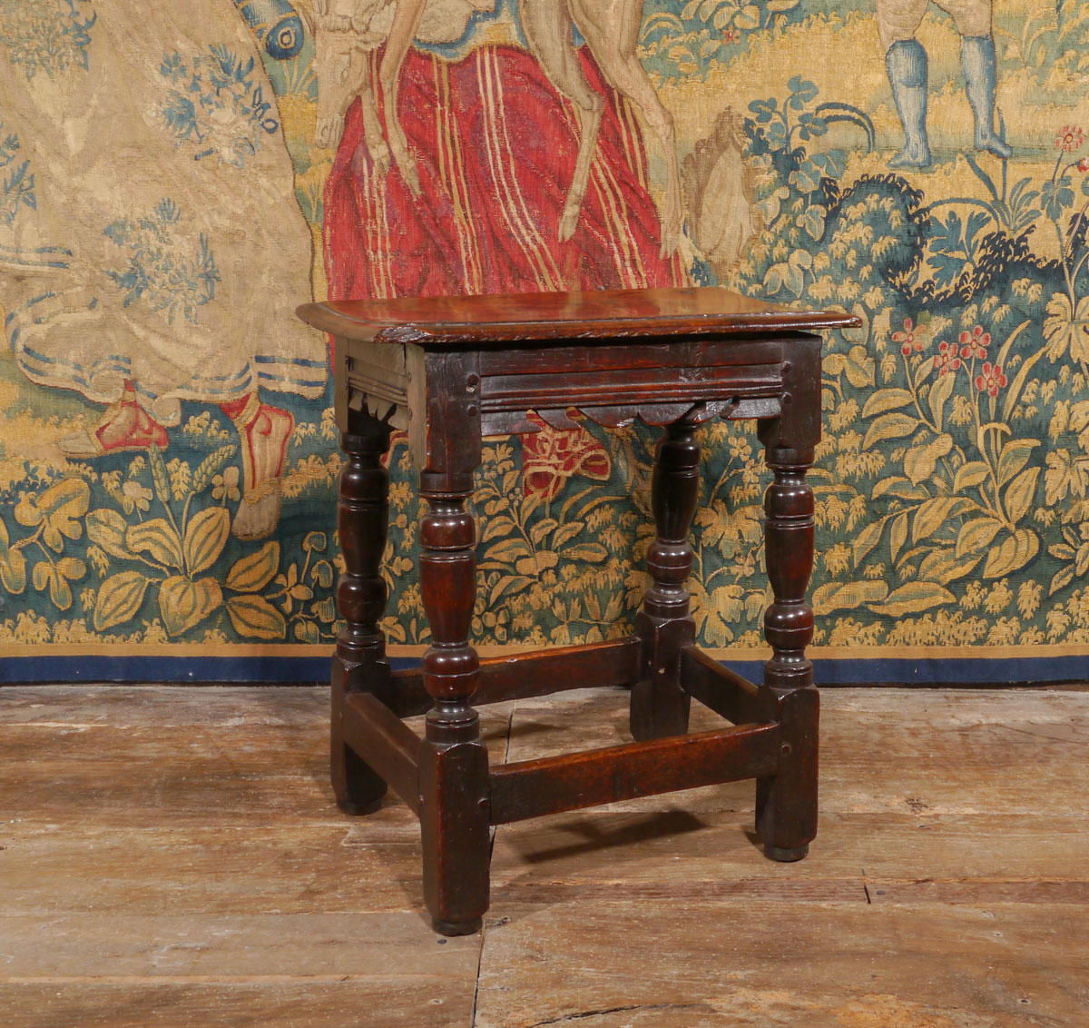 The boarded top of this impressive stool is secured by four pegs and supported on shaped and run moulded rails. The well-turned inverted baluster legs are joined by all round stretchers.