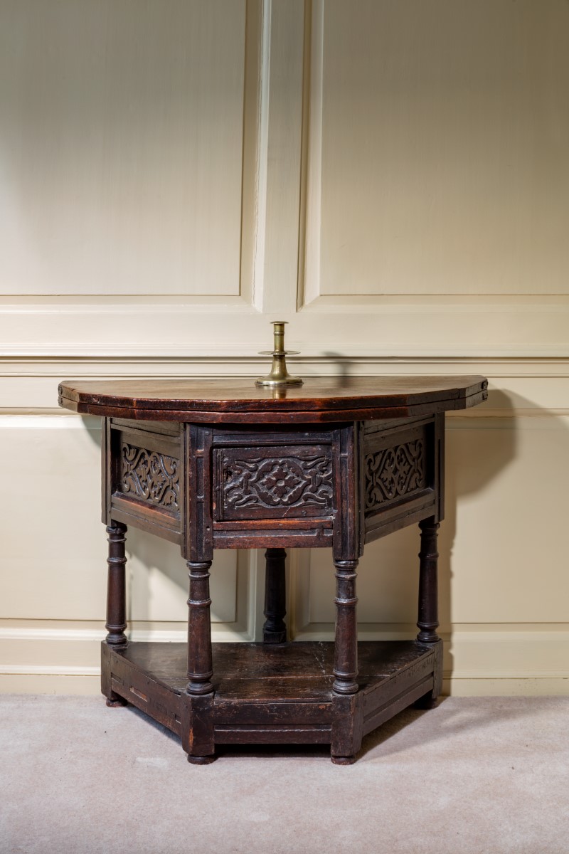 A Charles I oak folding table or "credence" table, the thick plank top supported on a rear leg which pulls out from the main body. The enclosed cupboard beautifully carved and supported on heavily turned baluster legs, which terminate in the original bun feet. The stretchers supporting the original potboard. (This is one the most original Charles I folding tables I have seen).