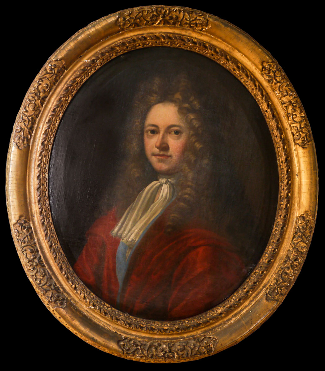 A late 17thcentury portrait of a young gentleman – possibly Sir Pury Cust (1655-1698), contained in its original carved and gilded oval “Lely” style frame, with raised panels of scroll and flower decoration.