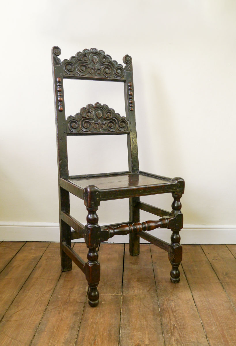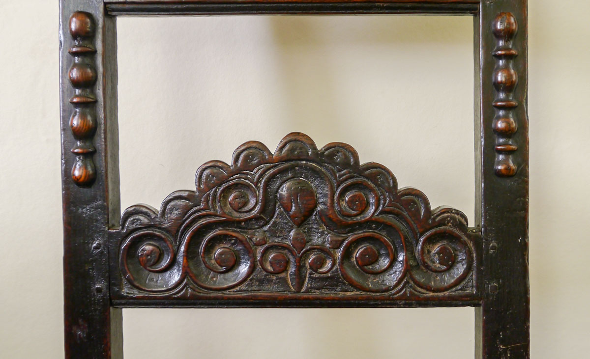 The twin horizontal splats, richly carved with scrolls around a stylised face, or mask – often thought of as that of Charles I. Most unusually on this type of chair, the splats are flat across the bottom, and not upwardly arched as is normally found. The uprights decorated with bold split balusters, and terminating in inward-facing scrolled finials.