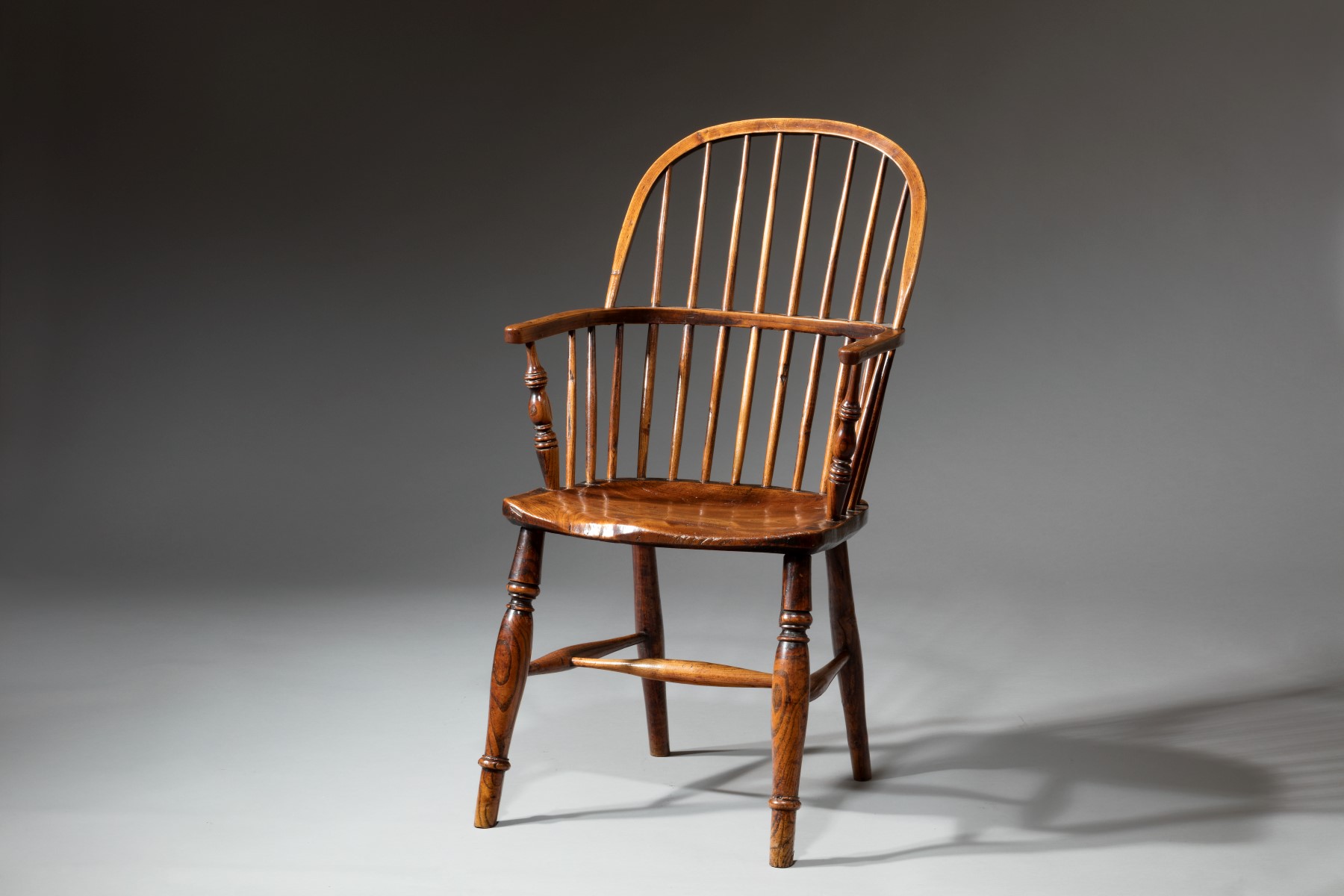 A very elegant low back Windsor armchair, made in beautifully grained ash, with an elm saddle seat. The lack of a central splat gave rise to the name "Stick Back", and was most commonly found in the Lincolnshire chair making tradition. It is also usual for this type of chair to have single-ring turned front legs, whilst the back legs remain plain. This chair is clearly stamped "Taylor of Grantham" (fl 1800-1843) at the rear of the seat. Lovely original nut brown colour and deep patination.