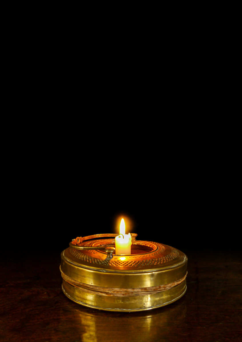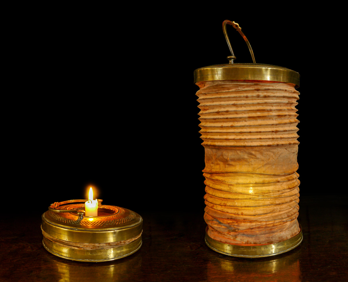 Two short brass “posts” set into the pierced cover are used to locate a hooped carrying handle, which when lifted pulls a linen shield up and around the candle, to protect the flame from drafts, which may be encountered as the device is carried along gloomy unlit passageways, as the owner moves from room to room.