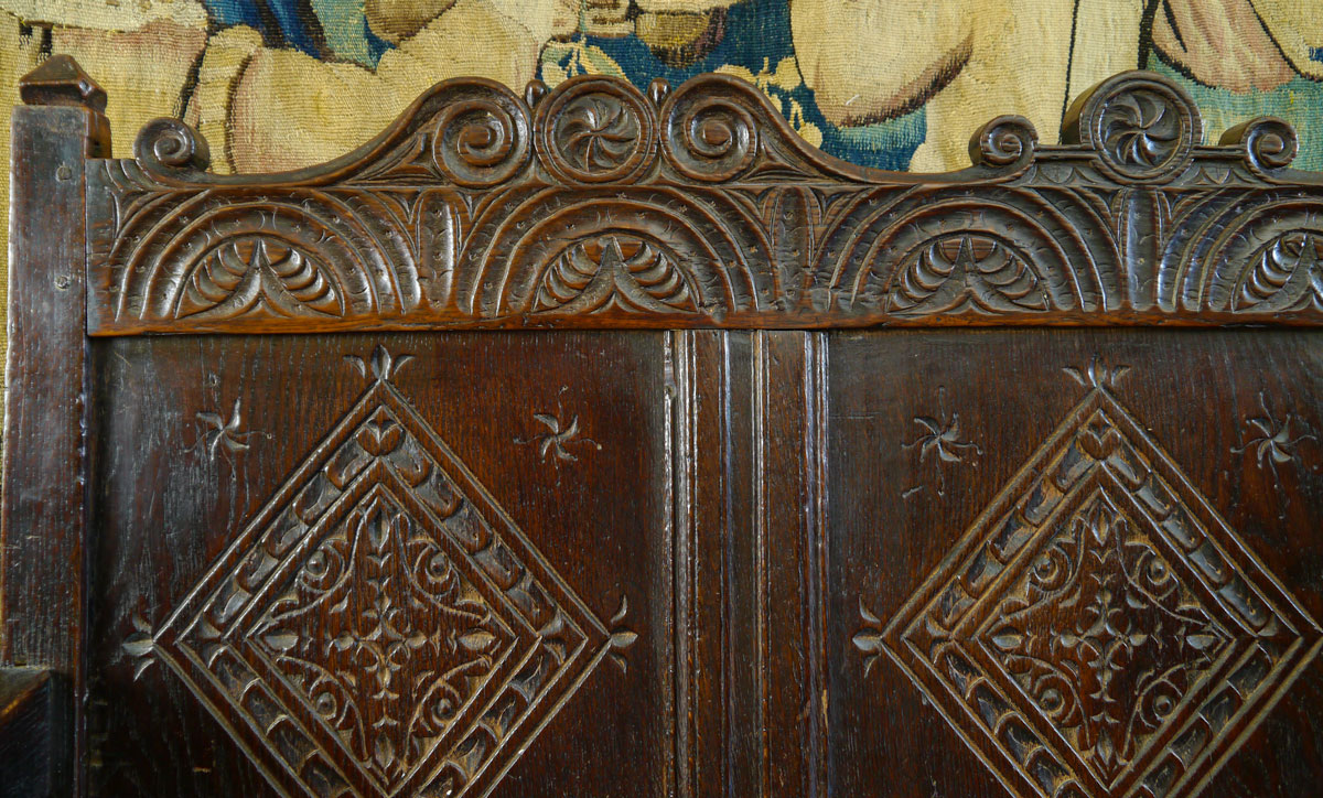 The triple panel back, with large central lozenge carving, decorated with whorls in the corners, below a wonderfully shaped top rail, with six carved lunettes, each with a stylised leaf centre, and further punch-decoration. The scrolling crest to the top rail is a most unusual feature – very reminiscent of crests found on wainscot chairs of the same period.