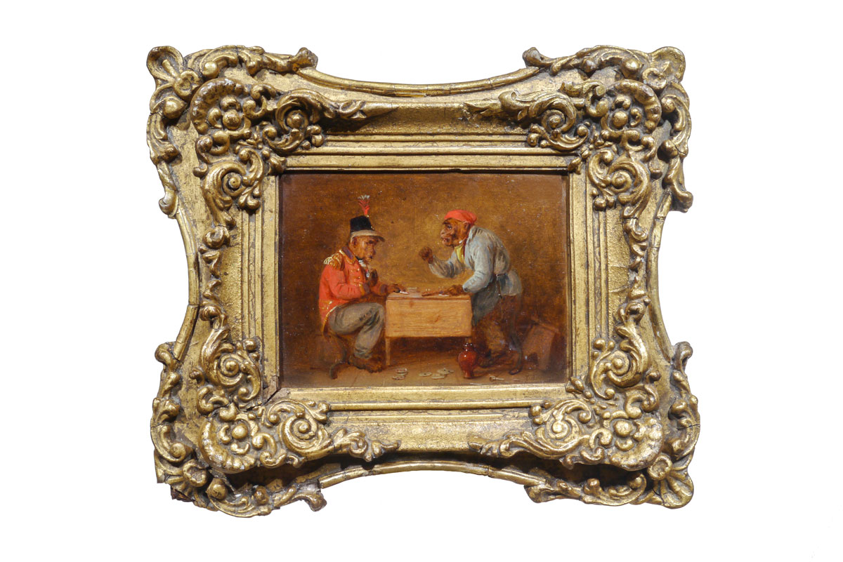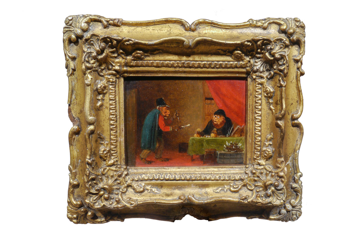 Three early 19th century oil on board caricatures of monkeys in slightly humorous scenes, all in the original carved and gilt frames.
