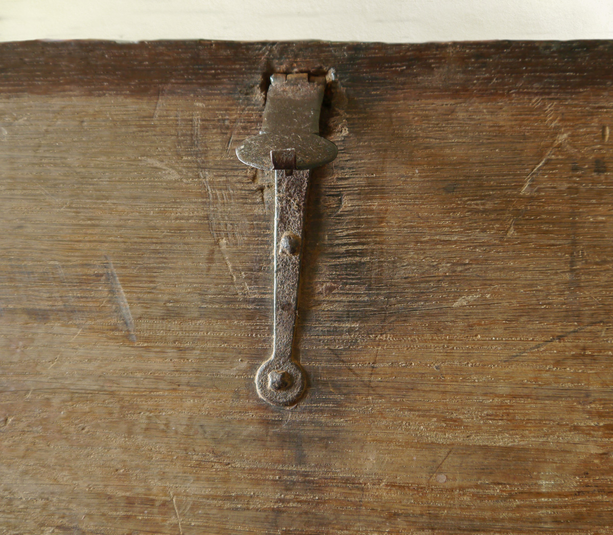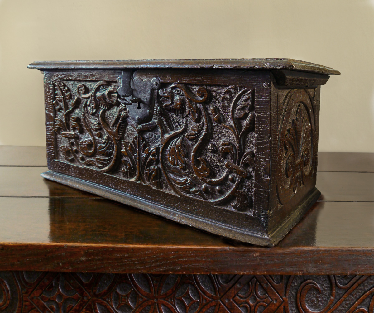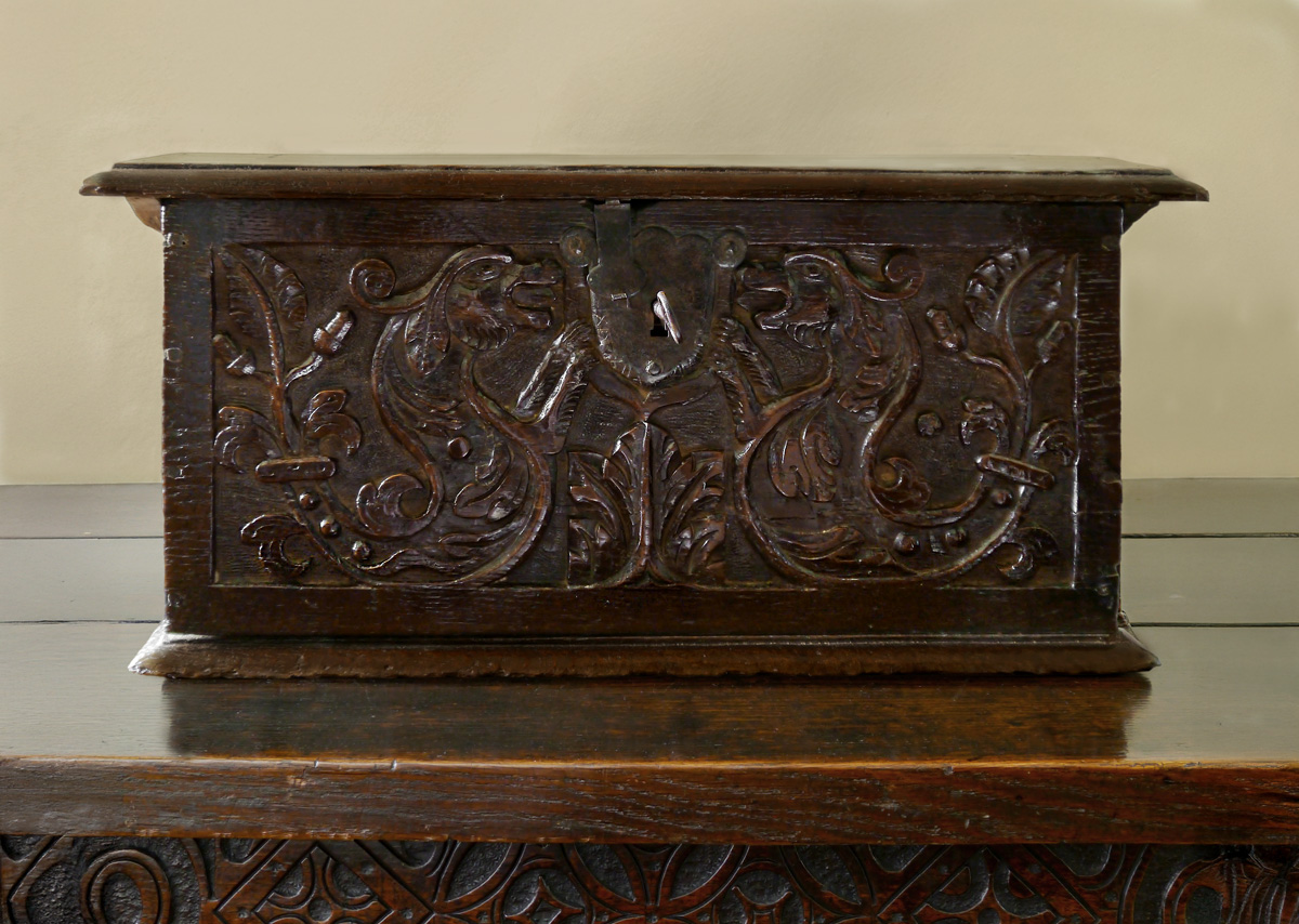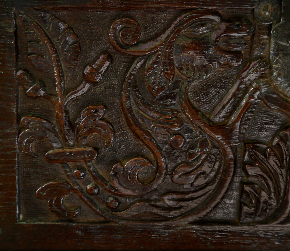 Having a single board top with moulded edge, and shaped “lopers” to each end, opening on lovely wire hinges, and retaining an iron hasp, with penny end. The carving to this early box is quite exceptional – the front panel shows two mythical beasts, possibly stylised dragons, facing a superbly shaped central lock plate, which retains the original key. Their scrolling bodies terminating in tales formed from a fleshy leaf, and acorns.