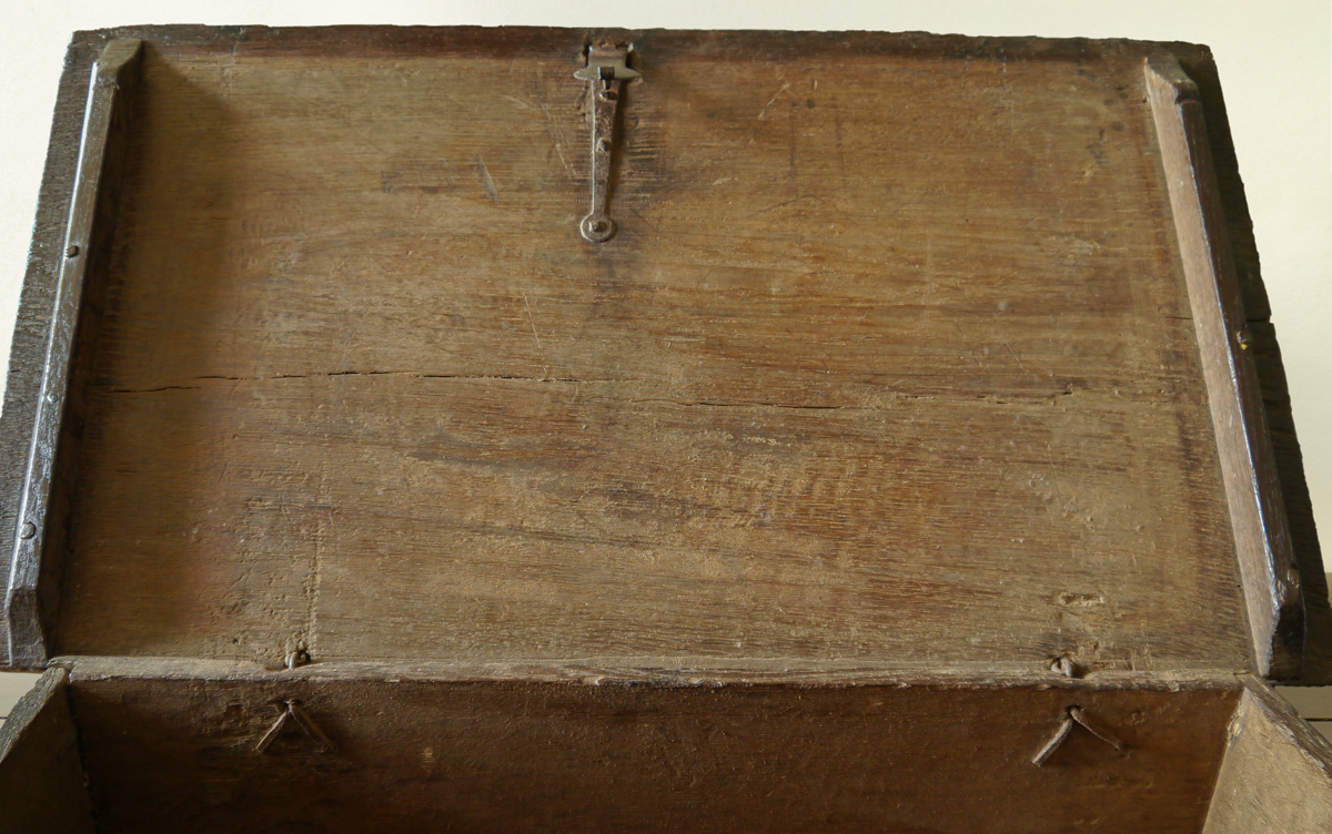 The construction of the box is unusual. Each aspect is formed from a single board, which are pegged together with oak dowels, rather than being nailed as would normally be the case.