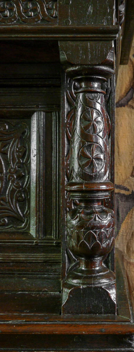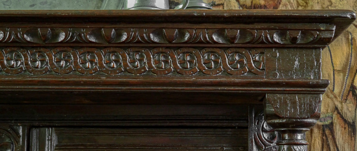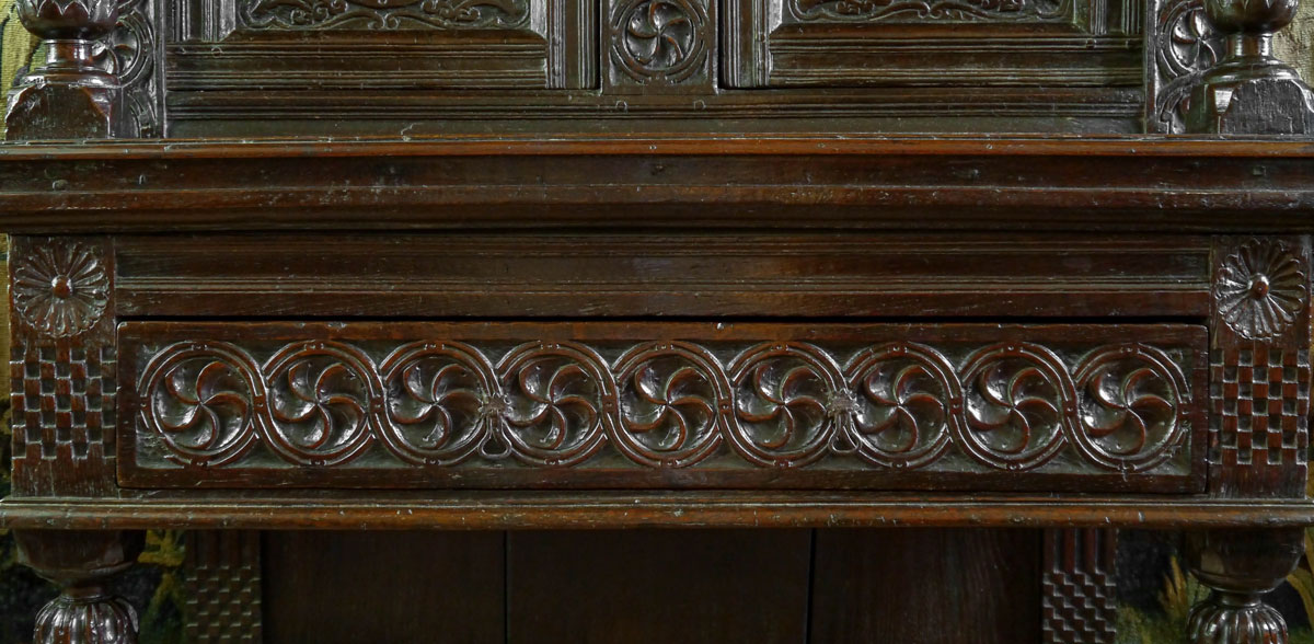 The single board top, above a guilloche carved frieze, supported on beautifully turned pillars, which again have a guilloche and petal carved design. Behind the pillars are two very well-carved doors – the panels with a central flower head, surrounded by tight scrolling foliage and set within a complicated run-moulded frame.