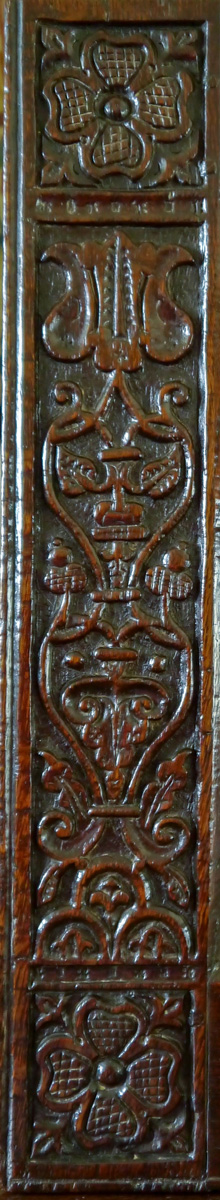 The rails of the cupboard are superbly carved with a stylised rose in each corner. The sides carved with a matching decoration of gilly flowers above scrolls, acorns and leaves. All supported on upturned semi-circles (a motif which is copied at the bottom of the marquetry panel). The top rail has floral carving – leaves, flowers and a central acorn. The bottom rail beneath the door is exquisite, having a central fleurs de lys, with scrolling stems, leaves and flowers.