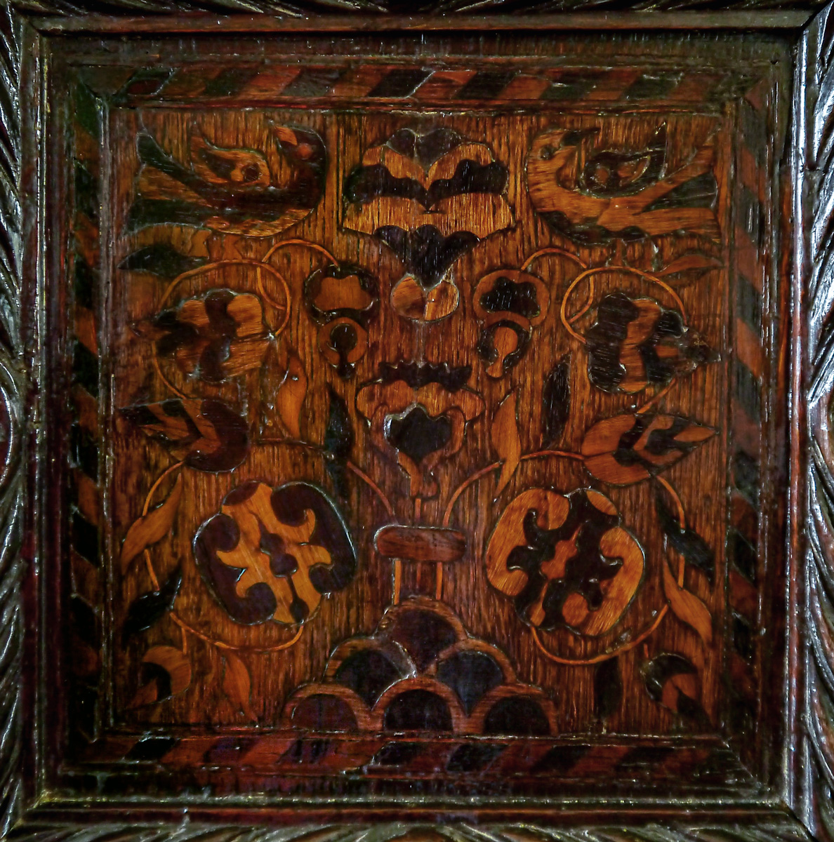 The central door, having a finely detailed marquetry panel, showing birds, flowers and trailing stems (note – the coloured woods, probably box and holly, are reversed to each side of the centre). To create a border, the coloured woods are used in a parquetry design around the edge, which is contained within an inner and outer band of stringing.
