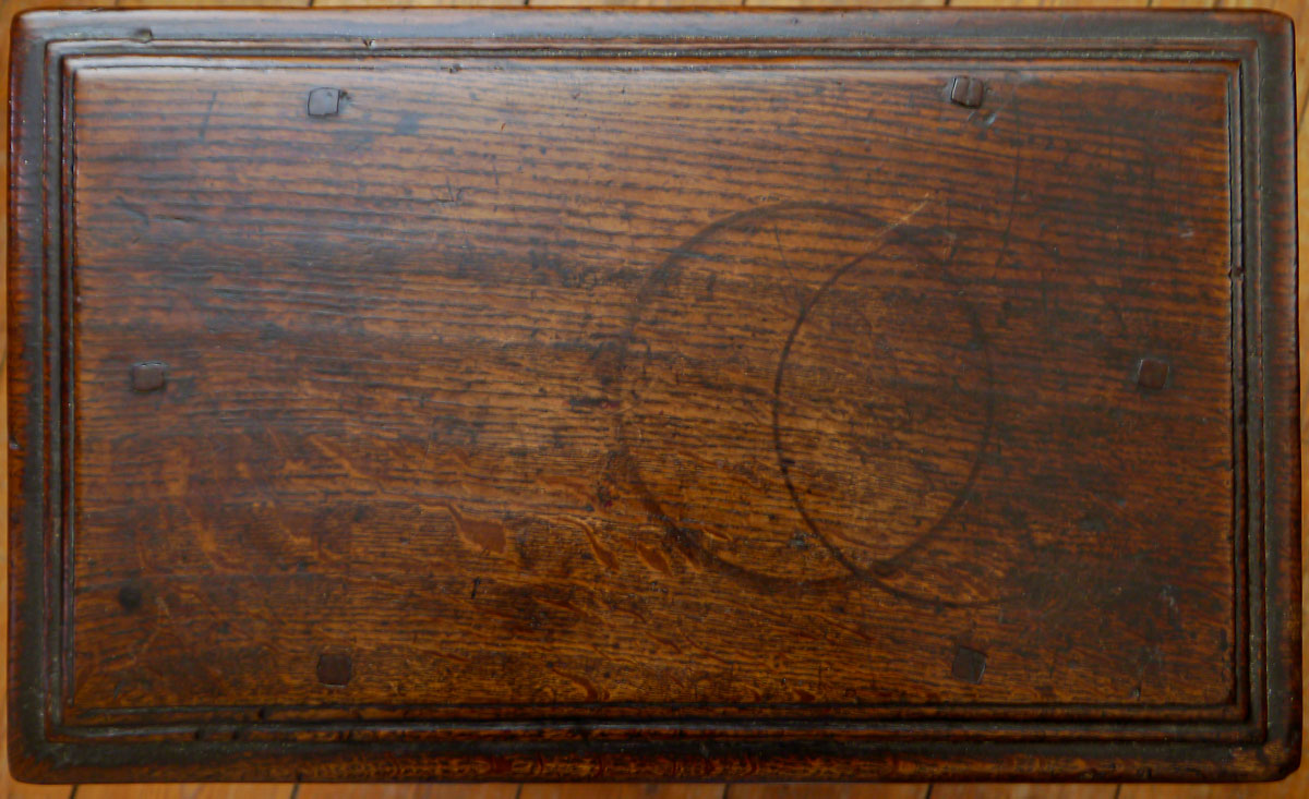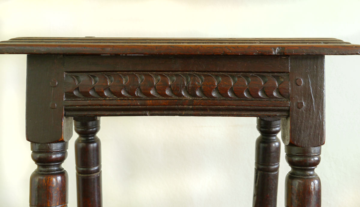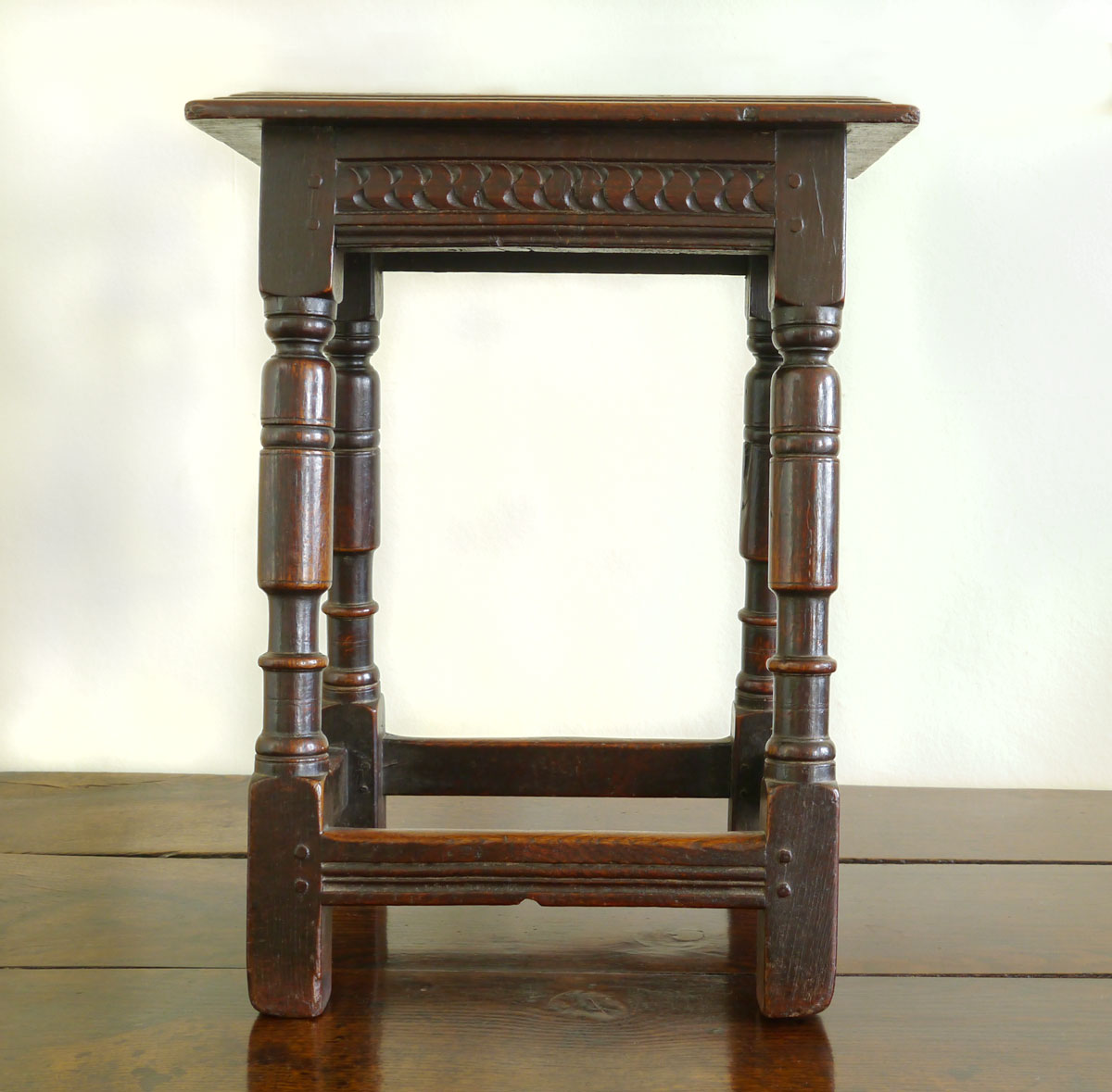 The triple-reeded boarded top, secured to the rails by six oak pegs. The rails themselves are carved with a “cable” type motif, often associated with the Salisbury area. The tall legs, beautifully turned, with a parallel baluster, the bottom of which finishes in a “reel”, slightly above the stretchers, which have a good run-moulded decoration – there is an excellent length of foot below the stretcher, giving height and tremendous presence to the stool.