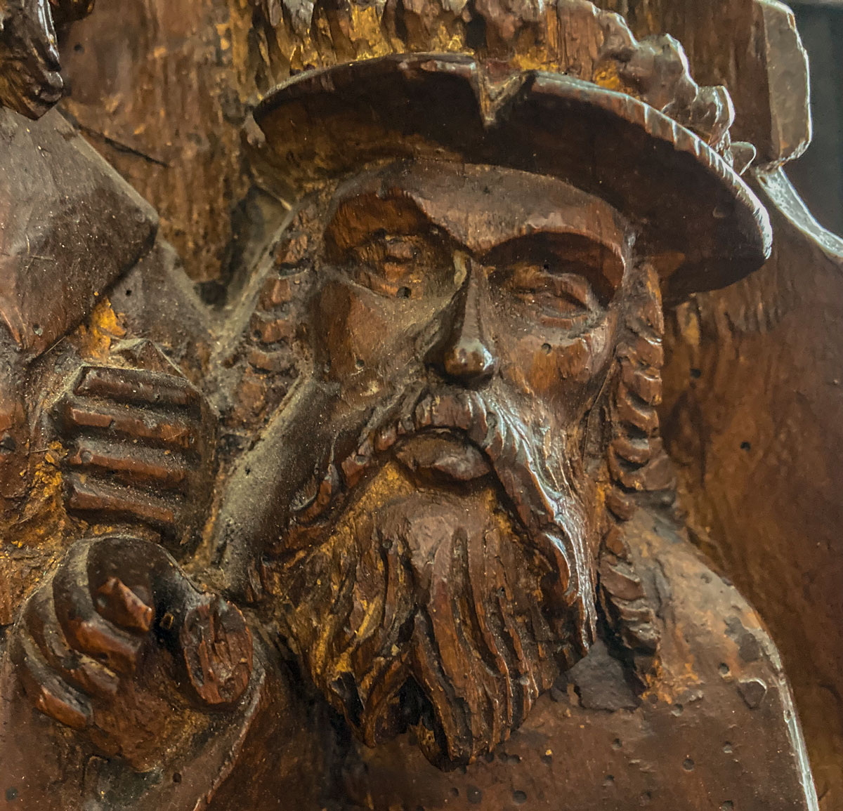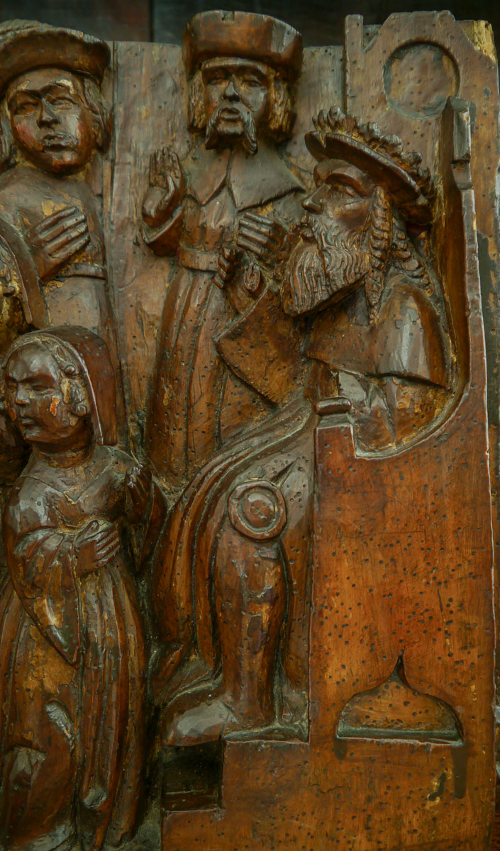 In this carving the four male figures are the priests and high priest (seated) of the temple. The lady looking forward is Anne – Mary’s mother – and of the two children, one is Mary, and the second Mary’s sister – Mary of Clopas (mother of James).