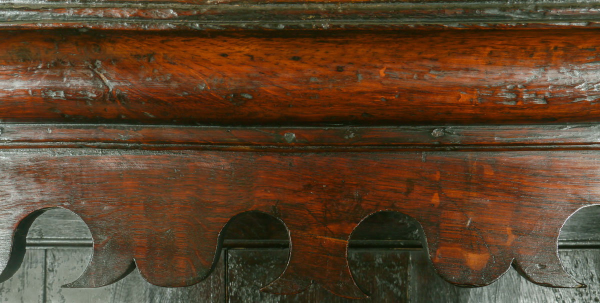 Three small working drawers above a fixed central panel flanked by a pair of cupboard doors, with exceptional arched and raised panels (the doors contain a lovely concealed locking mechanism). Again, like most Welsh furniture, the joiner has used oak for all his drawer linings, backboards and bottom boards.