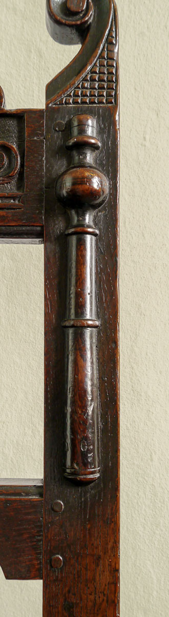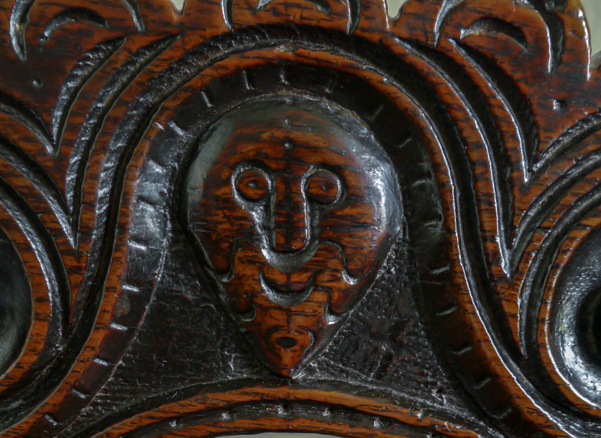 Note – it is not unusual to find a carved “mask” in the centre of the top splat, often thought to be the face of Charles I. However, of all the masks I have seen, this is the only one which is happily grinning!