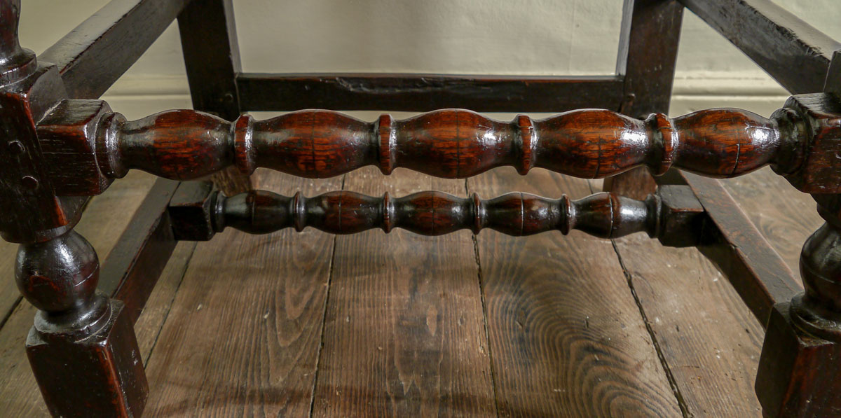 The boarded seat is deeply recessed to accommodate a cushion, the legs have simple ball turnings joined by an elongated bobbin and reel stretcher, which is repeated lower middle.