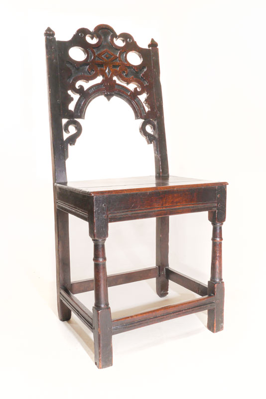 Often described as a Manchester Chair. The back has a distinctive geometric design, with an open crest at the top and finishing with an arch below supported on open side scrolls. The simple turned legs, with a single knop towards the top are joined with run moulded stretchers.