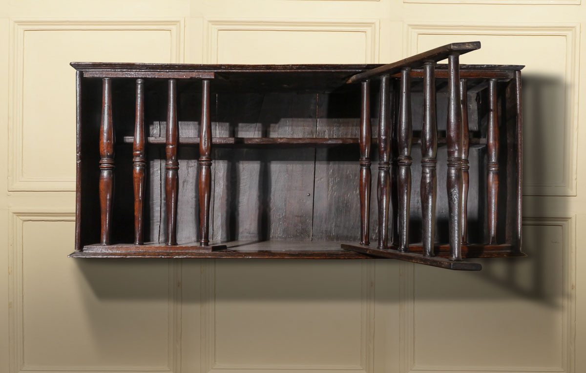Having an oak boarded back and ends, with single piece boards to the top and bottom, and a boarded shelf to the interior. The open front, retaining all the original turned cherry wood spindles, the centre five of which create a single door. It is unlikely this form of cupboard was ever used to store food, but far more likely that it was to show off the family’s highly valued glass.