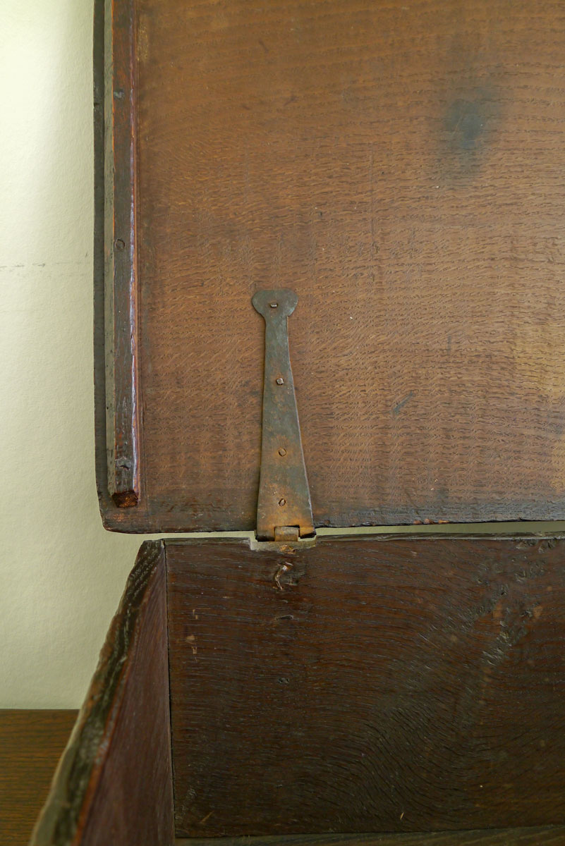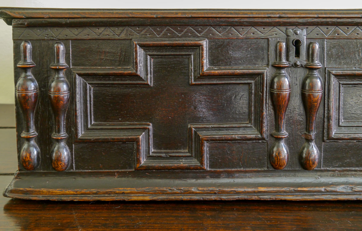 The top – formed from a single board of oak, and retaining the original strap hinges and bearers, above a fabulous geometric designed front. The two panels, decorated by mitred mouldings, are separated by beautifully turned split balusters, the centre pair just flanking the original iron escutcheon.
