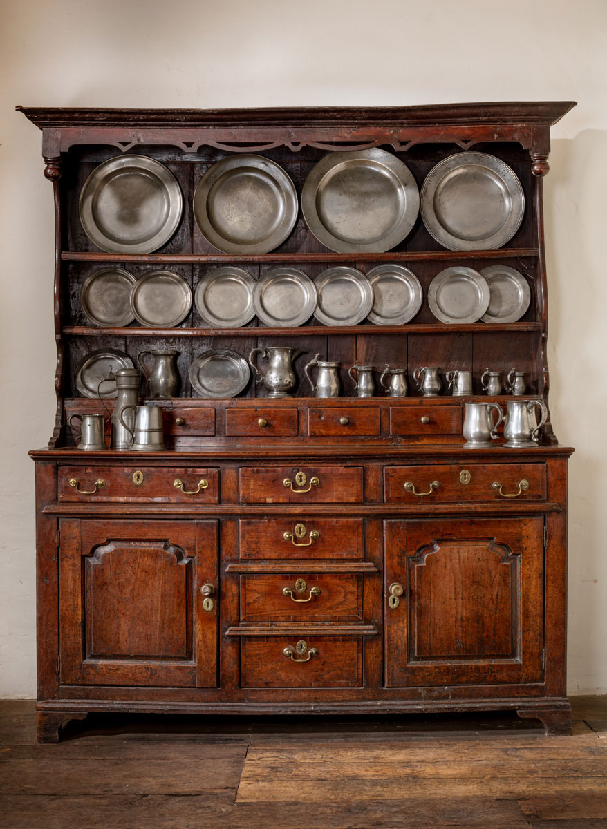 A traditional oak Welsh dresser, with fantastic detailing. The canopied rack is well shaped, with wide oak backboards. Under the overhanging cornice, there is a shaped and fretted frieze, with "droppers". The sides are shaped and "bellied" with a row of six spice drawers running along the bottom. The base has a twin borded top with six drawers below, all crossbanded in fruitwood and separated by strong waist mouldings. Flanking the drawers are two cupboard doors with well-shaped, fielded panels. The dresser, which has a wonderful soft, nutty brown patination, was unquestionably made by a very skilled joiner. A piece for a collector of Welsh furniture.