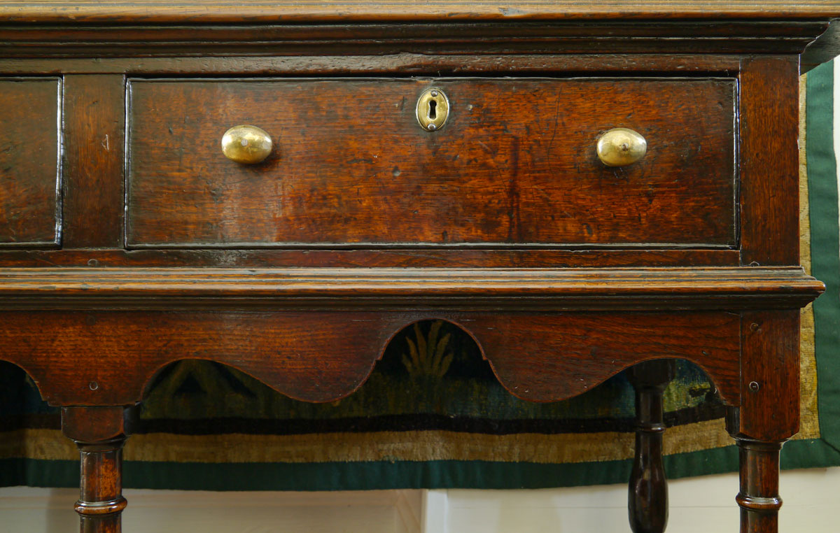 The base, with three drawers above a waist moulding, and deeply-shaped apron, which continues around the sides, supported on bold baluster-turned legs, four across the front and two to the rear. A sign of a slightly more thoughtful joiner – it is usual to find the back legs to be square-sectioned, and not turned.