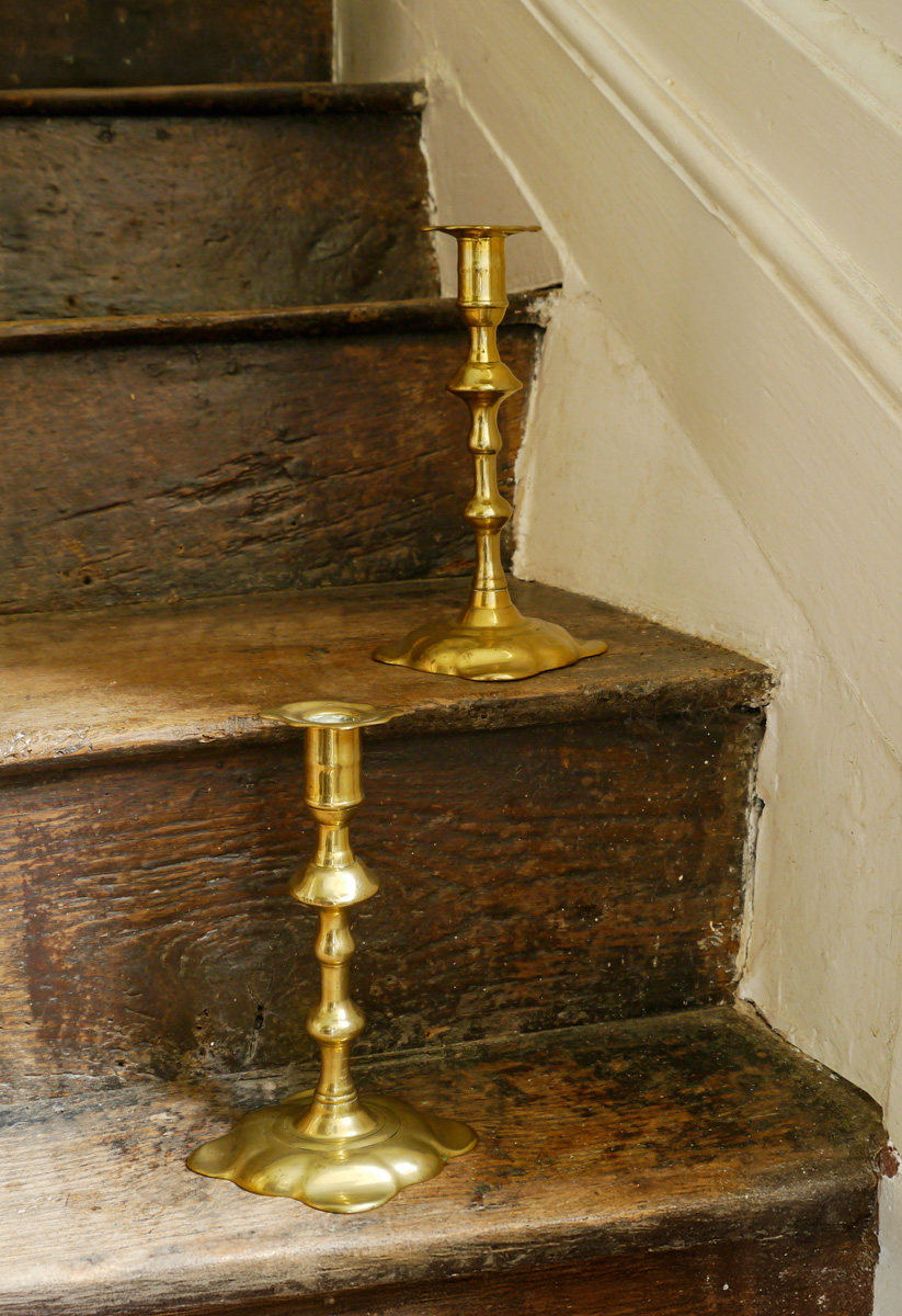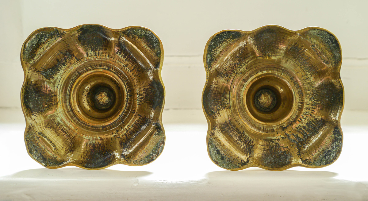 The shaped bobeche, mimicking the curves of the base, with brazing line which runs down the well-shaped stem of the candlestick. The underside of the base bearing the stamp of George Grove.