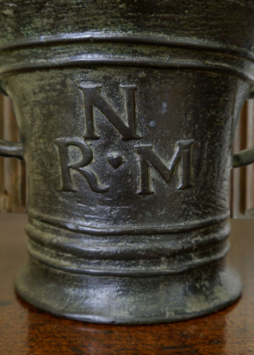 Having a triad of marriage initials N over R M, which are centred around a small heart. To the reverse is the date 1707. The body of the mortar has ring, or “wire” decoration around the top and base, the loop handles are decorated with a twist down the centres.