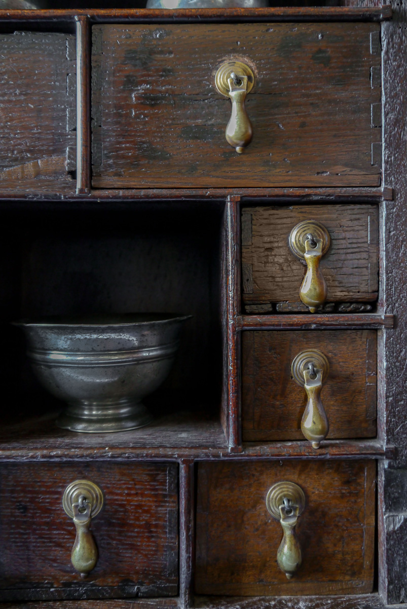 The door opens to reveal a fitted interior of 9 small drawers, all with their original brass pulls, set around a central compartment which would have housed a bronze mortar to grind the spices stored in the drawers. The full-length horizontal compartment at the top would have stored the pestle for use with the mortar, and possibly pewter bowls to mix the spices.