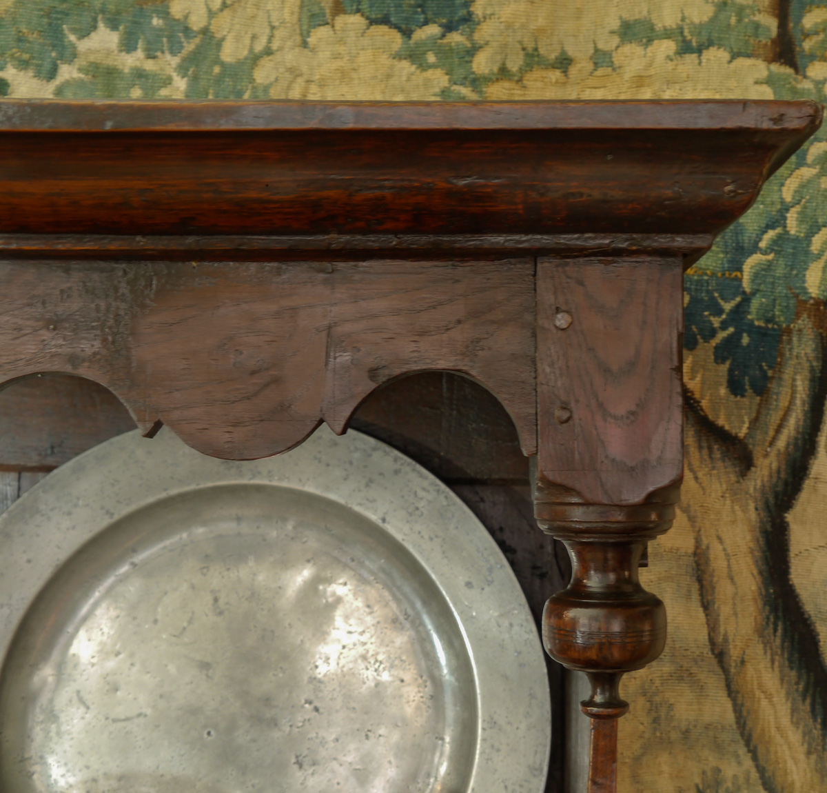 Of delightfully small size, this archetypal Welsh dresser was made in Denbighshire in the first quarter of the 18th century. The extremely well-shaped rack possesses all the features that are true to the area, the full canopy, extending almost to the front of the base, has a shaped frieze with turned pendants, or "droppers" at each end. The sides of the rack have a proper "belly" shape, and terminate at the bottom in a well-shaped foot. The vertical back boards are oak and random widths, supported top and bottom by horizontal bearers.
