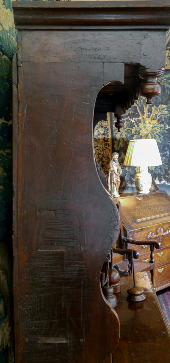 The top of the base is formed from one "mirror-cut" (or butterflied) board, forming two individual pieces, which are secured to the rails with square oak pegs. Below the boarded top are three oak-lined drawers, with raised, or fielded, panel fronts, below these are two cupboard doors, each with a pair of raised panels to match the drawers.