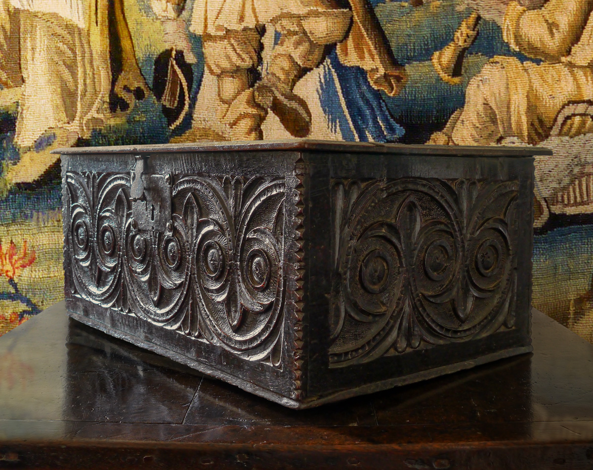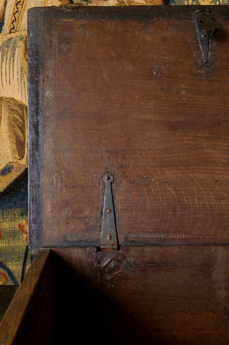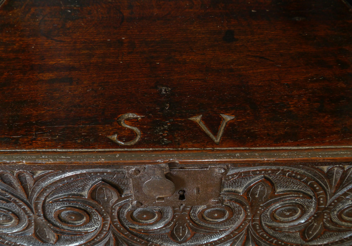 As is the norm of this type of table – or deed box – the top is boarded (in this instance a single piece of oak) with a double-reed edge moulding, and most unusually has the initials of the original owner ‘S V’ carved to the front just above the iron hasp and lockplate.