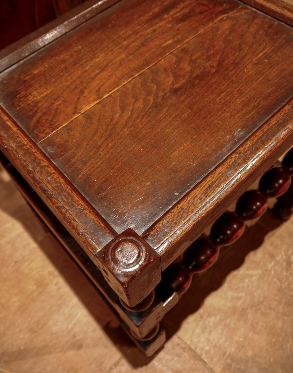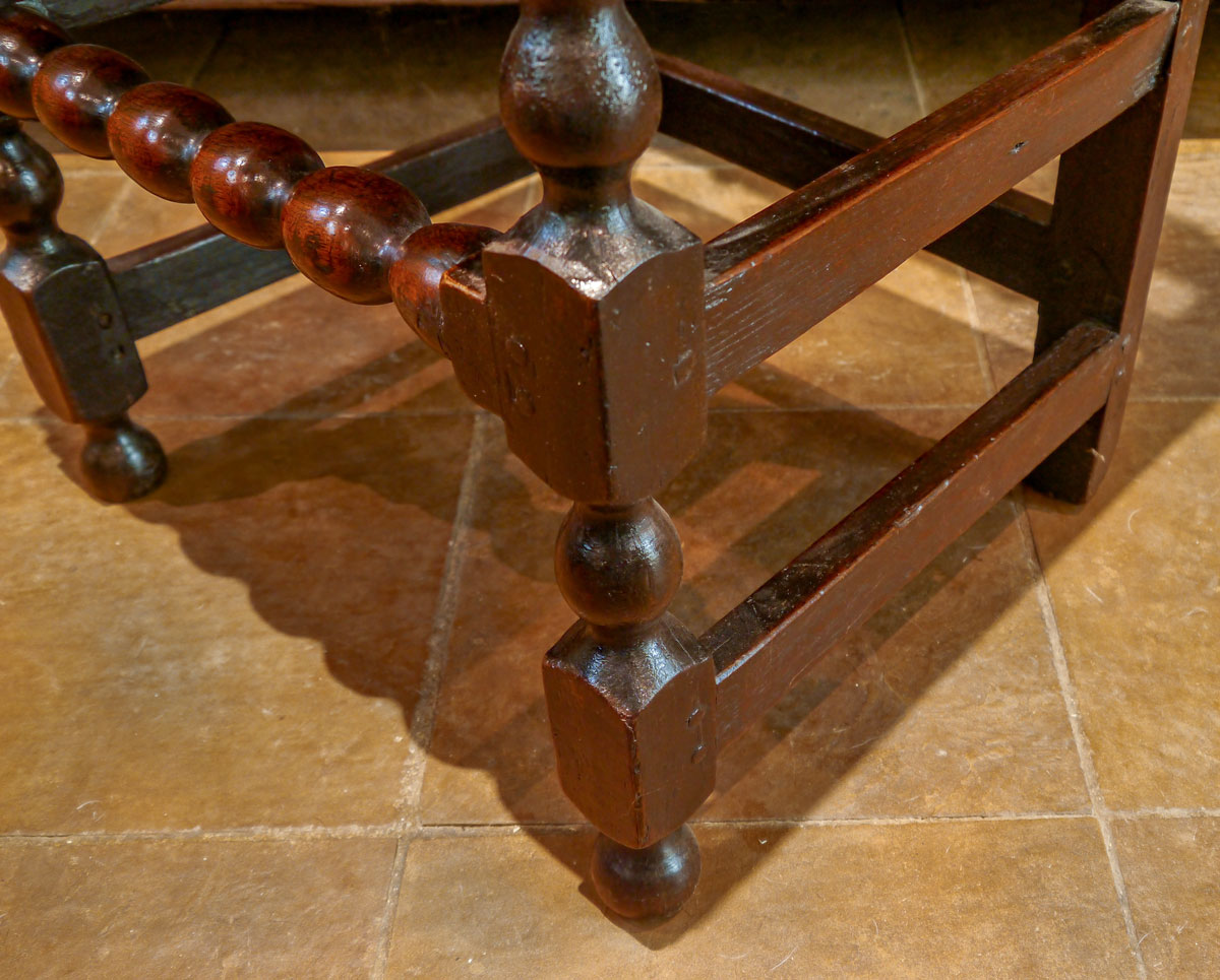The uprights have the correct split baluster decoration, and are further embellished with little chip-carved ciphers. Inset panel seat contained within moulded rails, and supported on bobbin-turned legs, joined by a similarly turned cross stretcher, with integral button, or draught turning at the top, and the original onion feet at the bottom.
