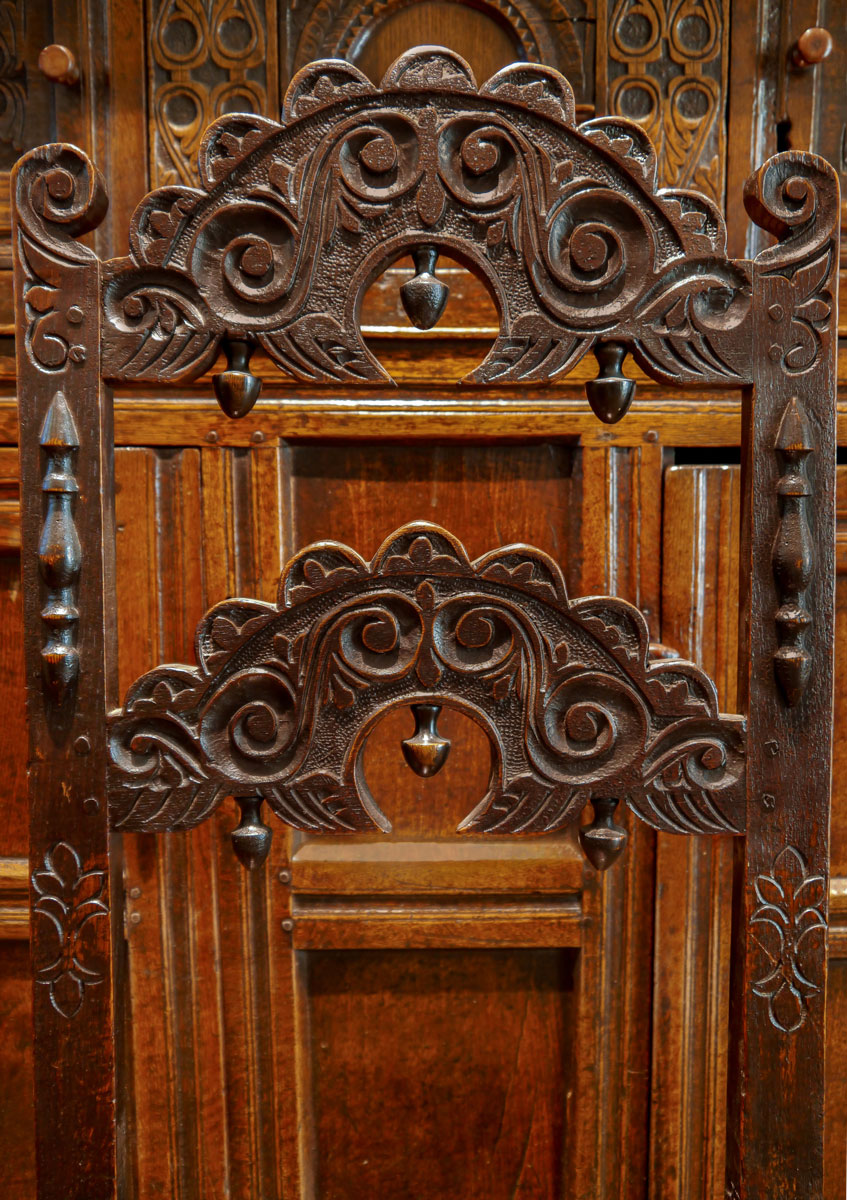 The centre of each splat has distinctive interlocking “S” scrolls, with a stippled, or matted, background. The bottom of the splats have the traditional distinctive outline, set around a central arch filled with dropping acorn pendants.