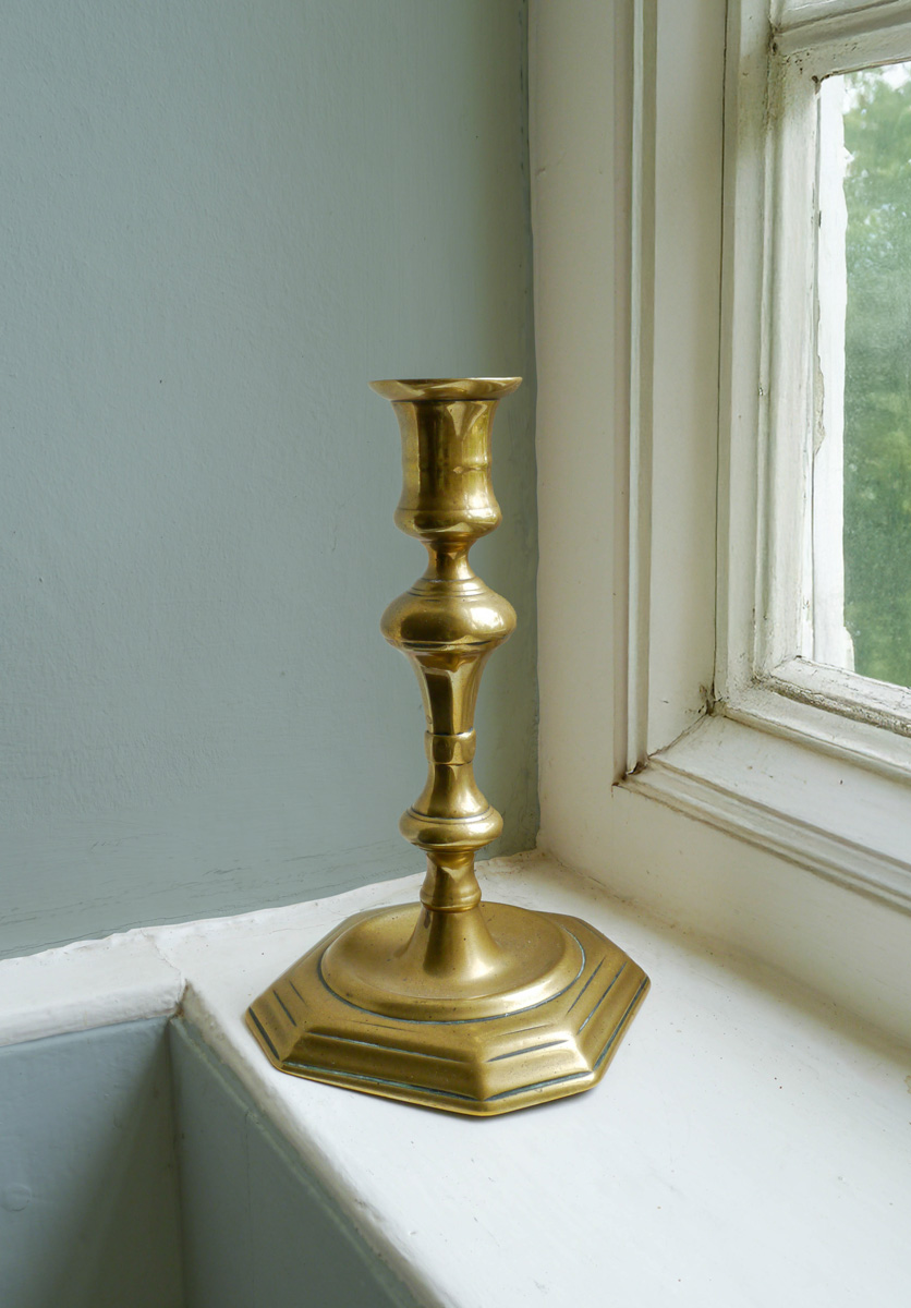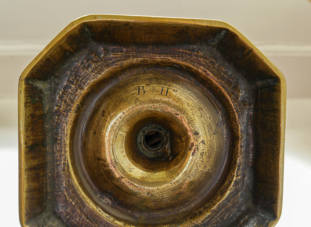 The stepped and raised foot is of the “cut corner” design, with a dished centre. Unusually, this candlestick has ownership initials engraved to the underside of the base – ‘B H’. The style of the engraving is very much of the period, suggesting these were the initials of the original owner.