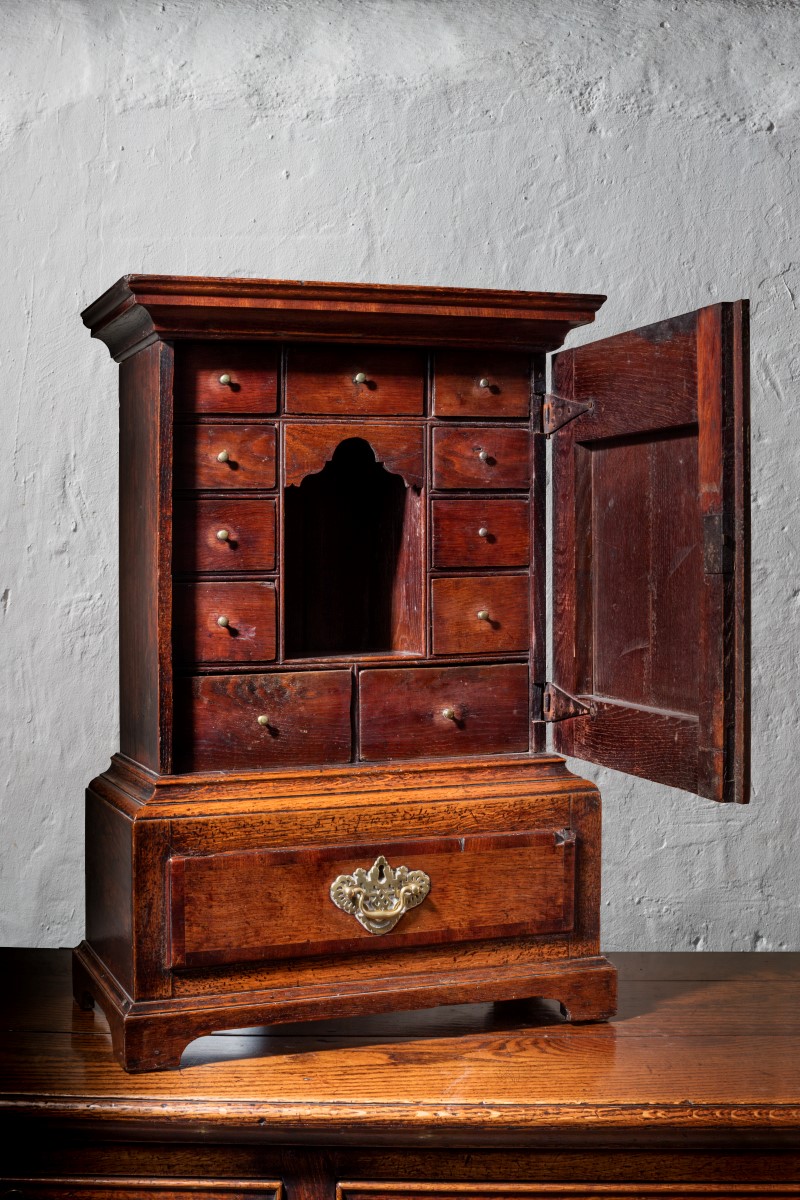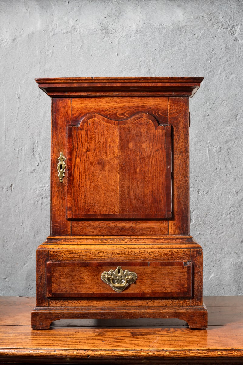 A magnificently proportioned George II oak table cabinet. A wide overhanging cornice sits above a door with a beautifully shaped panel which is crossbanded in mahogany to match the single drawer below. The interior is fitted with eleven spice drawers around a central arched niche, in which a mortar would have been kept. The wide waist moulding gives tremendous presence to this cupboard, suggesting it would have been used in a dining room, rather than a kitchen. Not only has the oak been lovingly polished to achieve a fine patina, but so have the original brass escutcheon and handle. The iron strap hinges are also original.