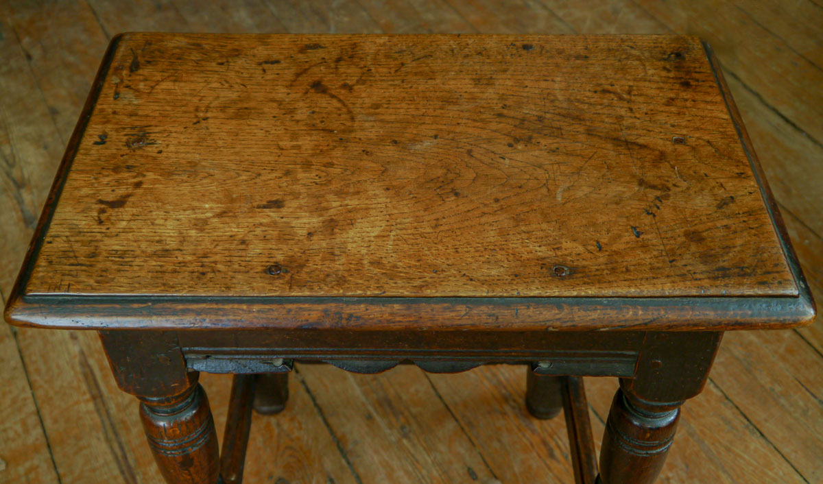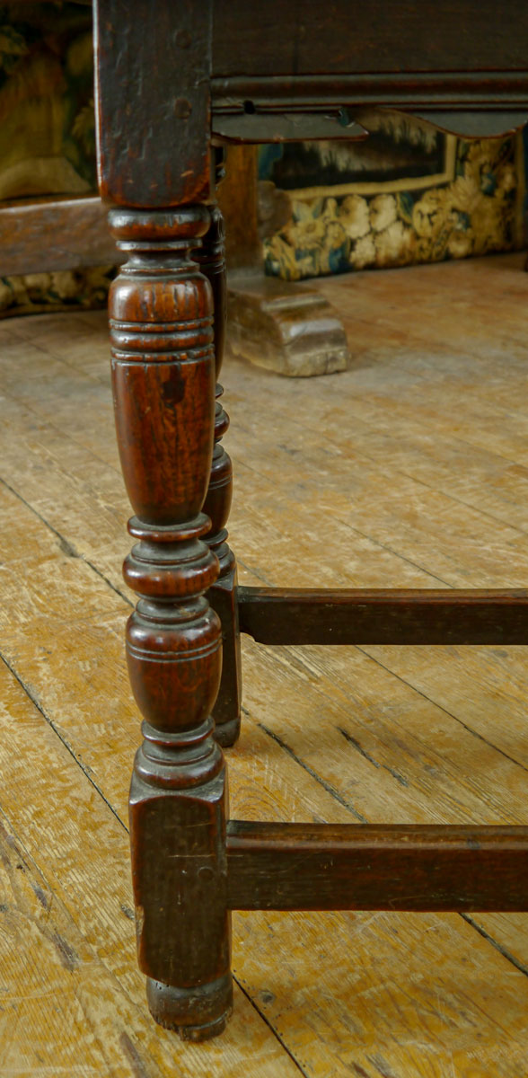 The beautifully figured thick boarded top, with a deep single moulding around the edge, secured to the moulded rails which have a shallow bicuspid shape to the bottom edge. The stout legs, with detailed and complicated turnings, joined by all round stretchers.