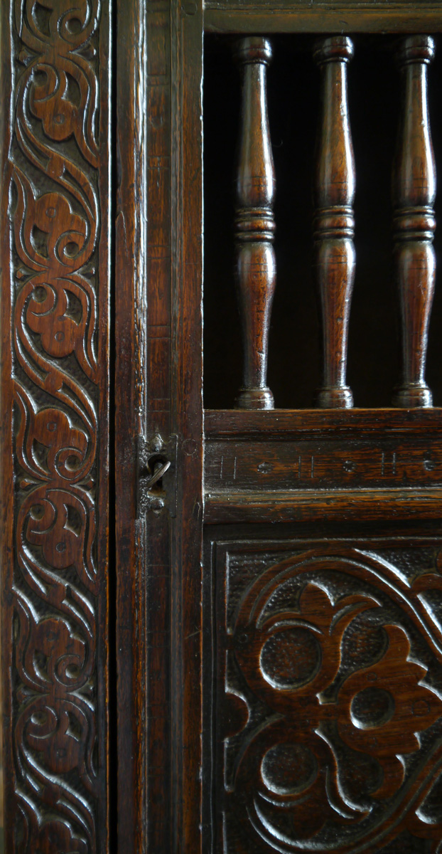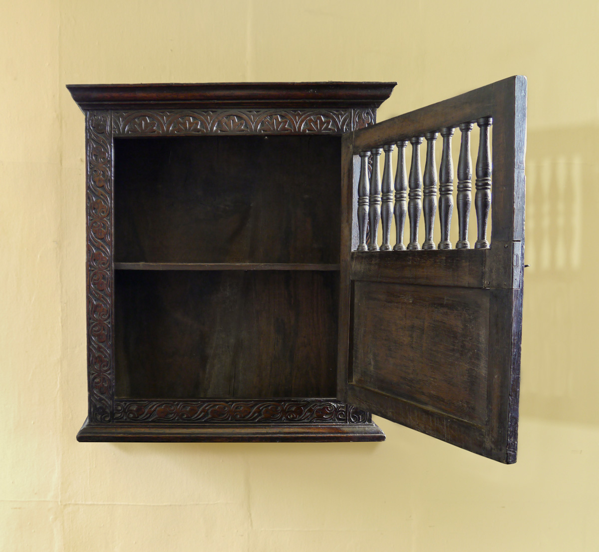 Having a single door, the upper section filled with 9 turned fruitwood spindles, above a well-carved panel, the pattern based on a series of interlocking 'C' scrolls, which terminate in stylised flowerheads.