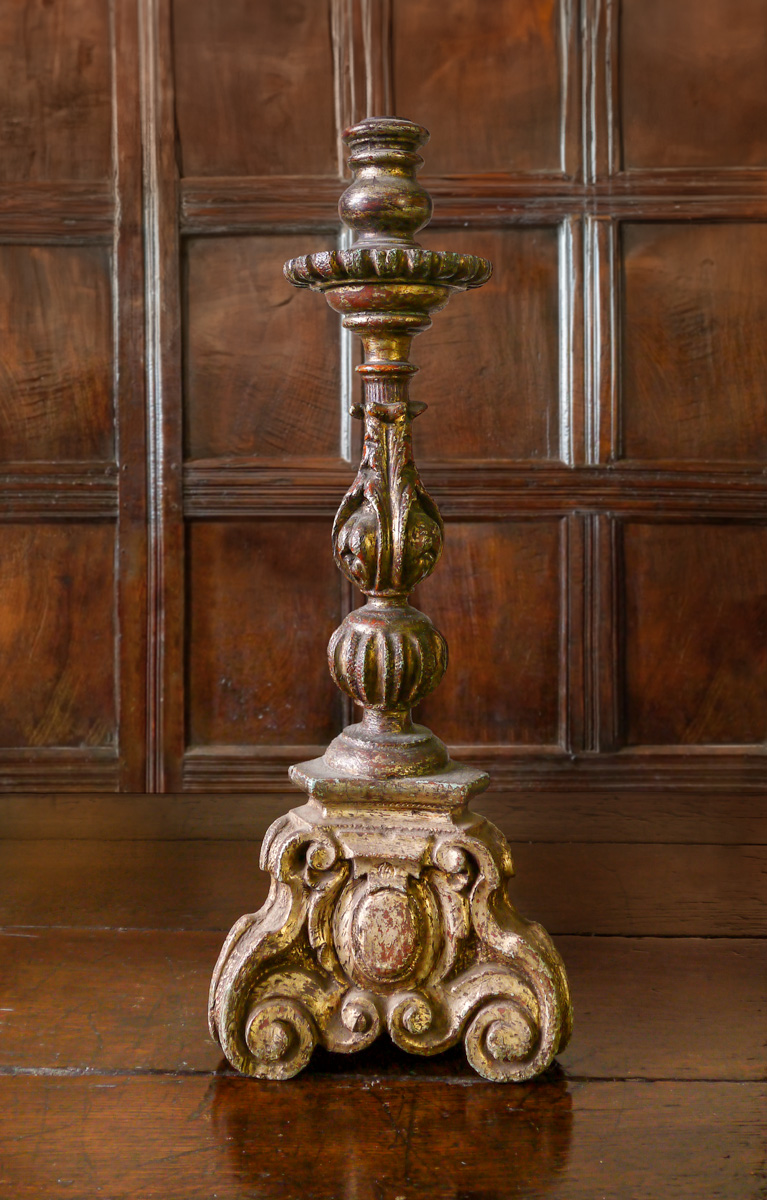 A Highly Decorative and Impressive Pair of Early 18th Century Carved and Gessoed Candlesticks