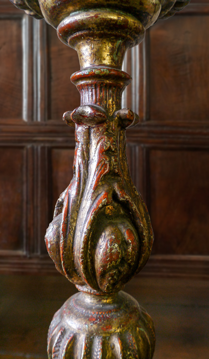 Having bold vase-shaped nozzles above stems carved with acanthus leaves and gadrooning. The spreading bases, with scrolled feet and central cartouches. The patinated silvered finish is over gesso (with the underlying terracotta colour just grinning through) and a carved wood base.